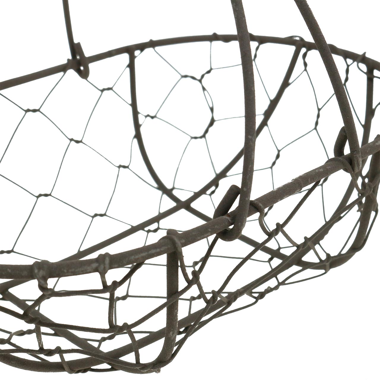 Le petit panier en treillis métallique robuste est peint en gris foncé, avec une surface légèrement rugueuse et mate rappelant la patine, ce qui rend le panier parfait pour un décor vintage. Un manche en bois recouvert d'une glaçure brun acajou contribue encore à cette impression noble.