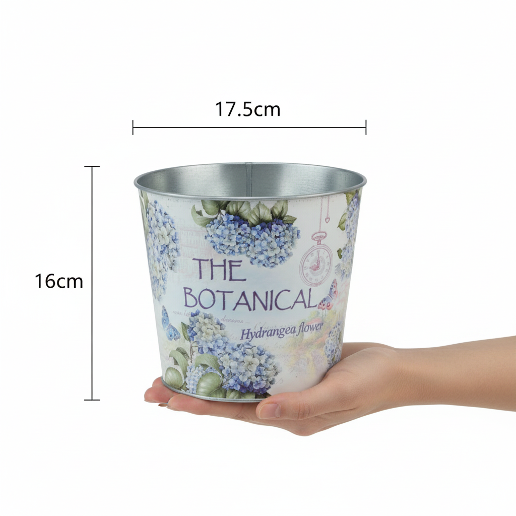 Des hortensias bleus et blancs fleurissent en abondance sur ce motif empreint de nostalgie, tandis que des papillons voletent autour de ce jardin. Le pot, quant à lui, ressemble à un simple seau sans anses. L'intérieur est galvanisé, mais les soudures le rendent non étanche ; il est donc conseillé de le tapisser de papier aluminium.