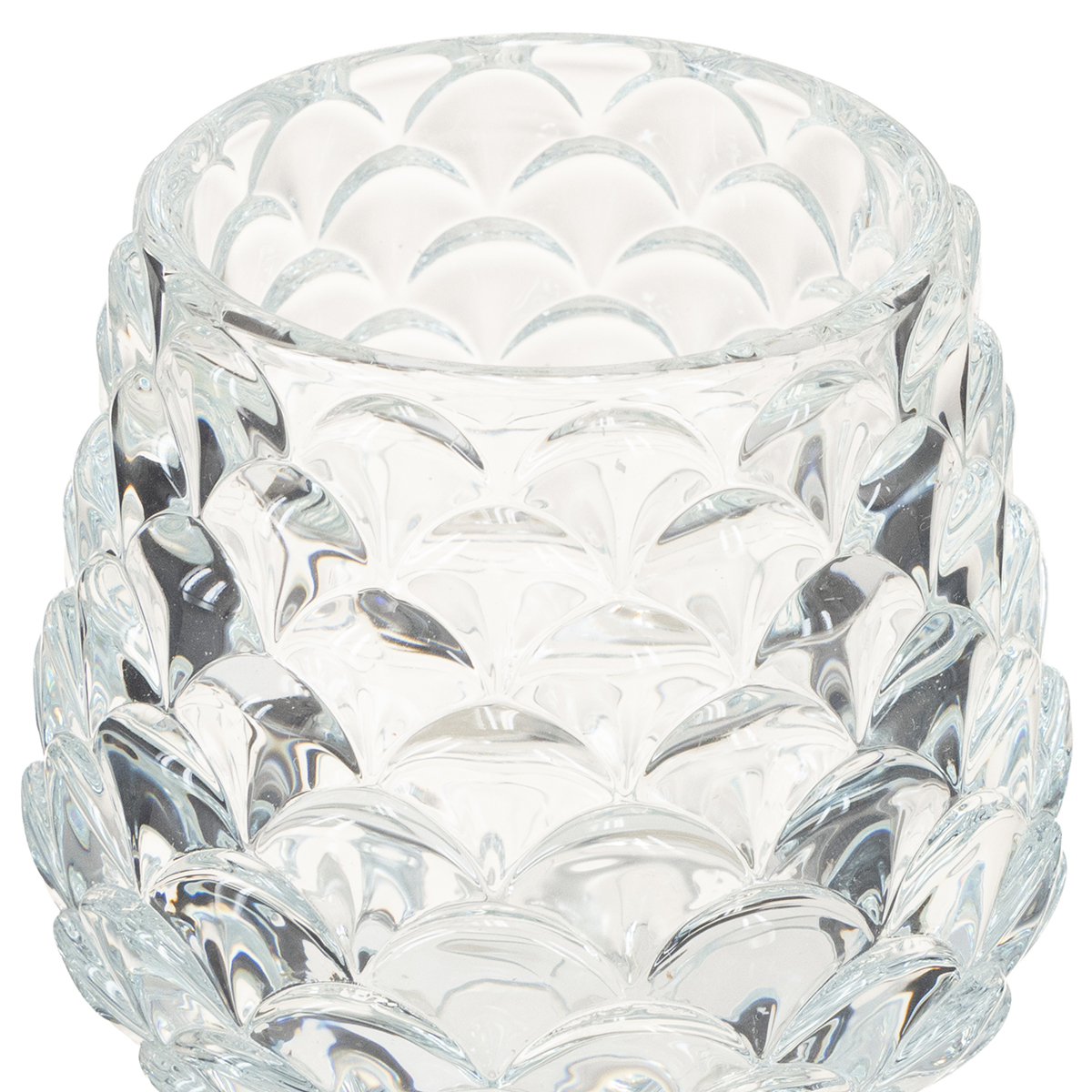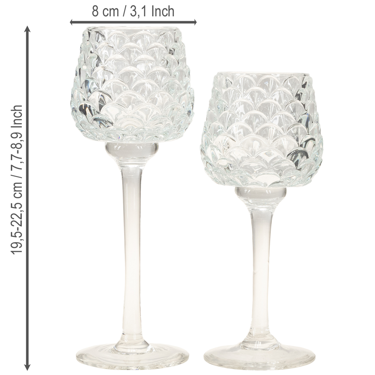 Parfois, ce sont les petits détails qui font toute la différence. Vous aimez créer une atmosphère chaleureuse et accueillante avec lumière et décoration ? Alors, vous adorerez les photophores en verre avec cônes et socle ! Cet ensemble, composé de deux photophores de différentes hauteurs, séduit par son élégance simple et son design sophistiqué qui s'intègre parfaitement à une grande variété de styles d'intérieur. Les lamelles en verre transparent rappellent une charmante pomme de pin : délicates, élégantes et intemporelles. Qu'il s'agisse d'attirer le regard dans le salon, d'illuminer une table de fête ou d'offrir une lumière romantique pour une soirée chaleureuse : ces photophores ont de multiples talents !