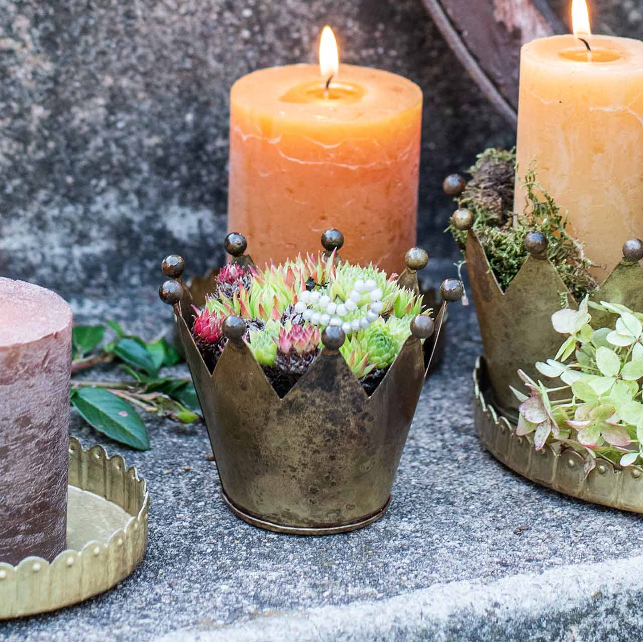 Ainsi, la petite décoration en métal s'intègre parfaitement dans la décoration de Noël ou vos bougeoirs en laiton. Mettez une bougie chauffe-plat dans la couronne en or ou utilisez la couronne décorative comme petite jardinière, par exemple pour les succulentes. Une bougie chauffe-plat à LED ou un mini arrangement est également enchanteur dans la couronne en laiton. Pour une petite décoration avant Noël, avec du papier aluminium comme cache-pot ou comme décoration pour l'Avent avec la plus grande couronne en métal dans le même style, vous trouverez toujours une utilité à la couronne.