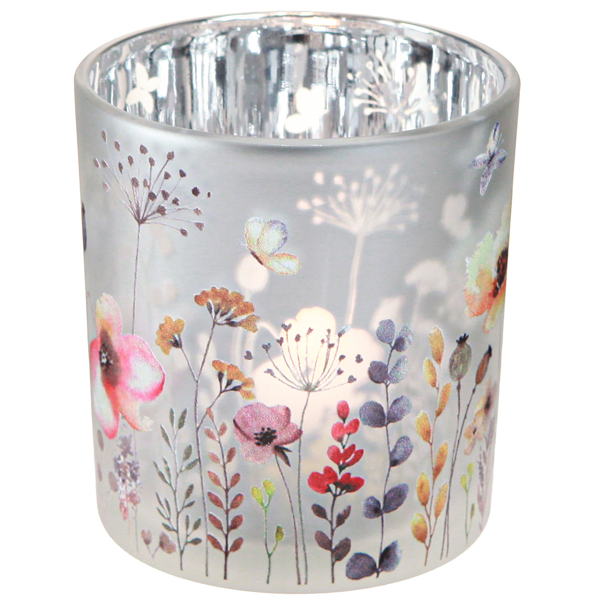 Ajoutez une touche printanière à votre intérieur avec notre charmant photophore en verre argenté et coloré. Ces bougeoirs uniques attirent tous les regards et apportent des couleurs fraîches et une esthétique printanière à votre espace de vie. Avec un effet 3D détaillé qui présente des papillons, des coquelicots et des motifs de prairies, n'importe quel intérieur se transforme en un paysage printanier romantique. La couche intérieure argentée rehausse encore l’éclat et la brillance des couleurs. D'une hauteur d'environ 8 cm et d'un diamètre d'environ 7 cm, ce verre décoratif s'adapte parfaitement à n'importe quelle table et est idéal pour les occasions festives, un dîner romantique ou comme décoration de salon stylée. Laissez-vous envoûter par la symbolique des coquelicots et des papillons, qui représentent le renouveau et la fraîcheur printanière.