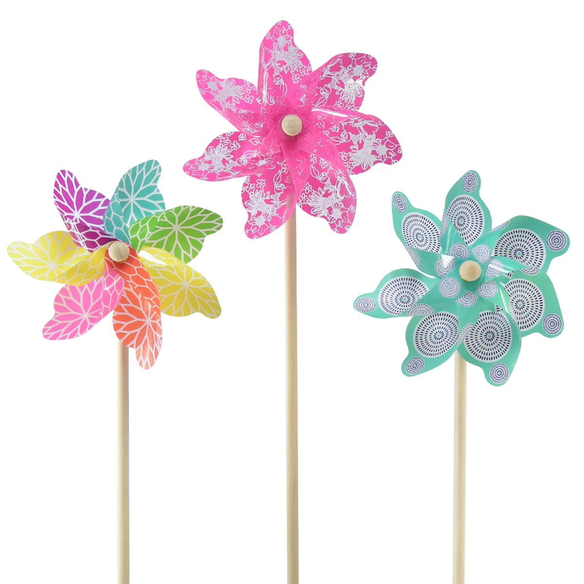 Vous obtenez un total de 3 éoliennes qui diffèrent par leur motif et leur couleur. Un moulin à vent est rose et décoré d’un motif floral partiellement transparent. Le moulinet turquoise présente des cercles noirs et blancs et le troisième présente une couleur différente sur chaque feuille, ponctuée d'une grande fleur bordée de blanc.