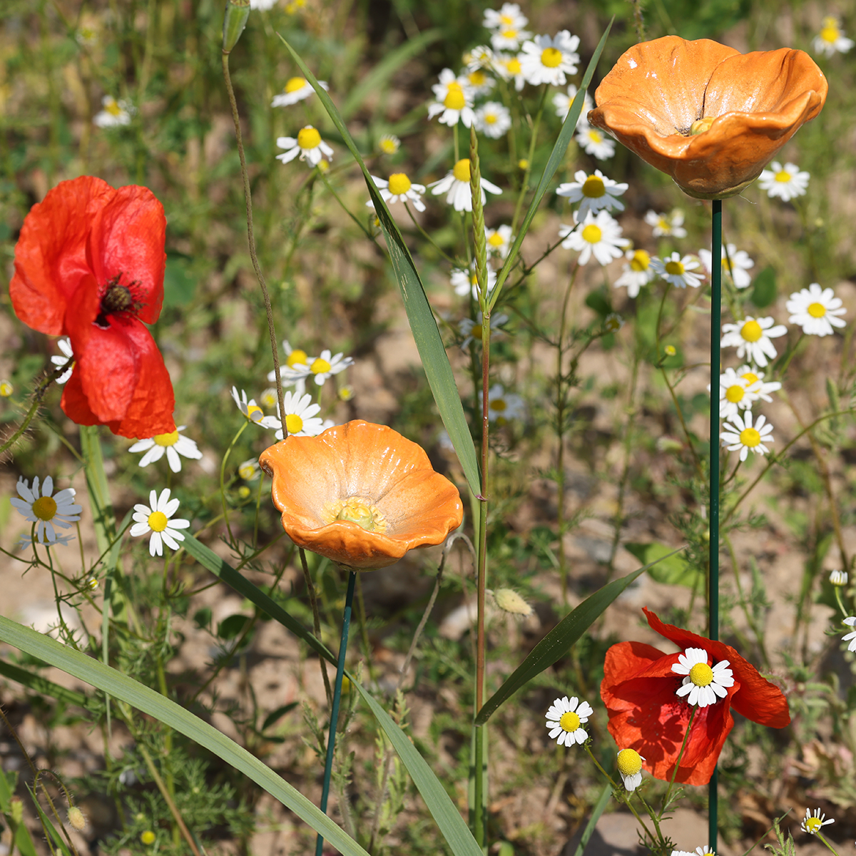 Nos tuteurs de coquelicots allient un design attrayant à une qualité supérieure. Confectionnés en céramique aux finitions soignées, ils séduisent par leur toucher haut de gamme et leurs détails raffinés. Les chaudes nuances orangées et blanches des pétales créent un effet vibrant, illuminant tout jardin. Grâce à leur aspect artisanal, ces tuteurs dégagent une élégance naturelle qui s'intègre parfaitement dans un jardin d'inspiration méditerranéenne ou champêtre. Associez ces fleurs à des plantes vertes ou à des pots aux tons neutres : elles se fondent harmonieusement dans le décor tout en affirmant leur présence.