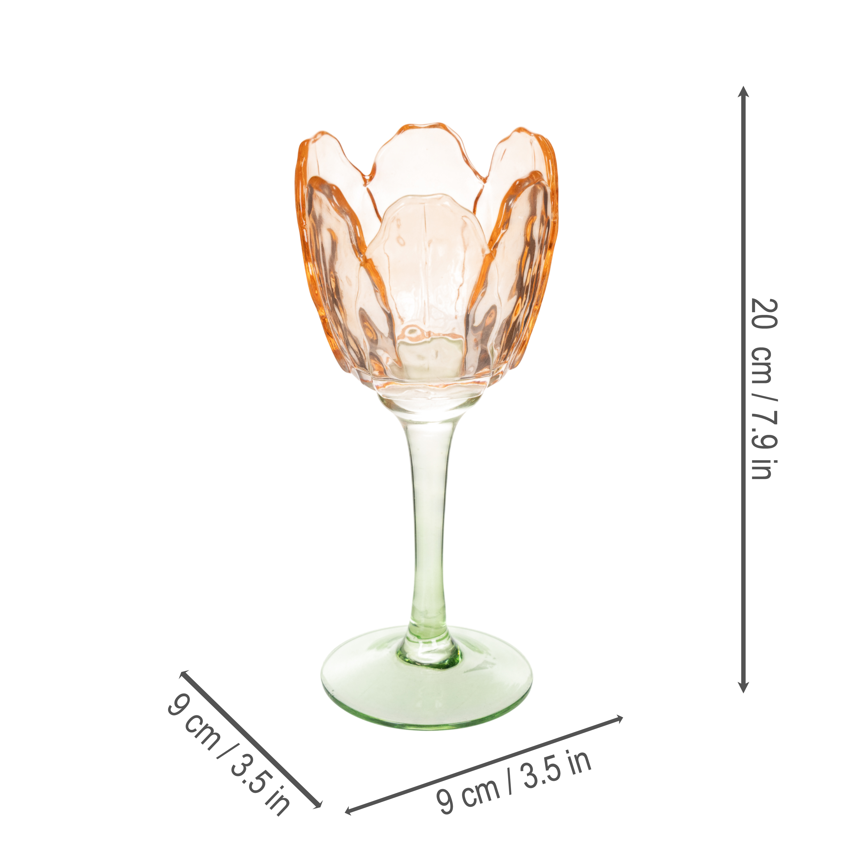 Ce photophore en verre séduit par sa forme élégante et sa polyvalence. Son ouverture en forme de fleur évoque une tulipe délicatement épanouie, conçue pour accueillir la douce lueur d'une bougie. Mesurant 9 centimètres de longueur, de largeur et de diamètre, et 20 centimètres de hauteur, il s'intègre harmonieusement à tous les intérieurs sans les encombrer. Les douces nuances orangées du verre s'accordent parfaitement avec une variété de styles de décoration, du rustique au shabby chic, en passant par le moderne et le romantique.