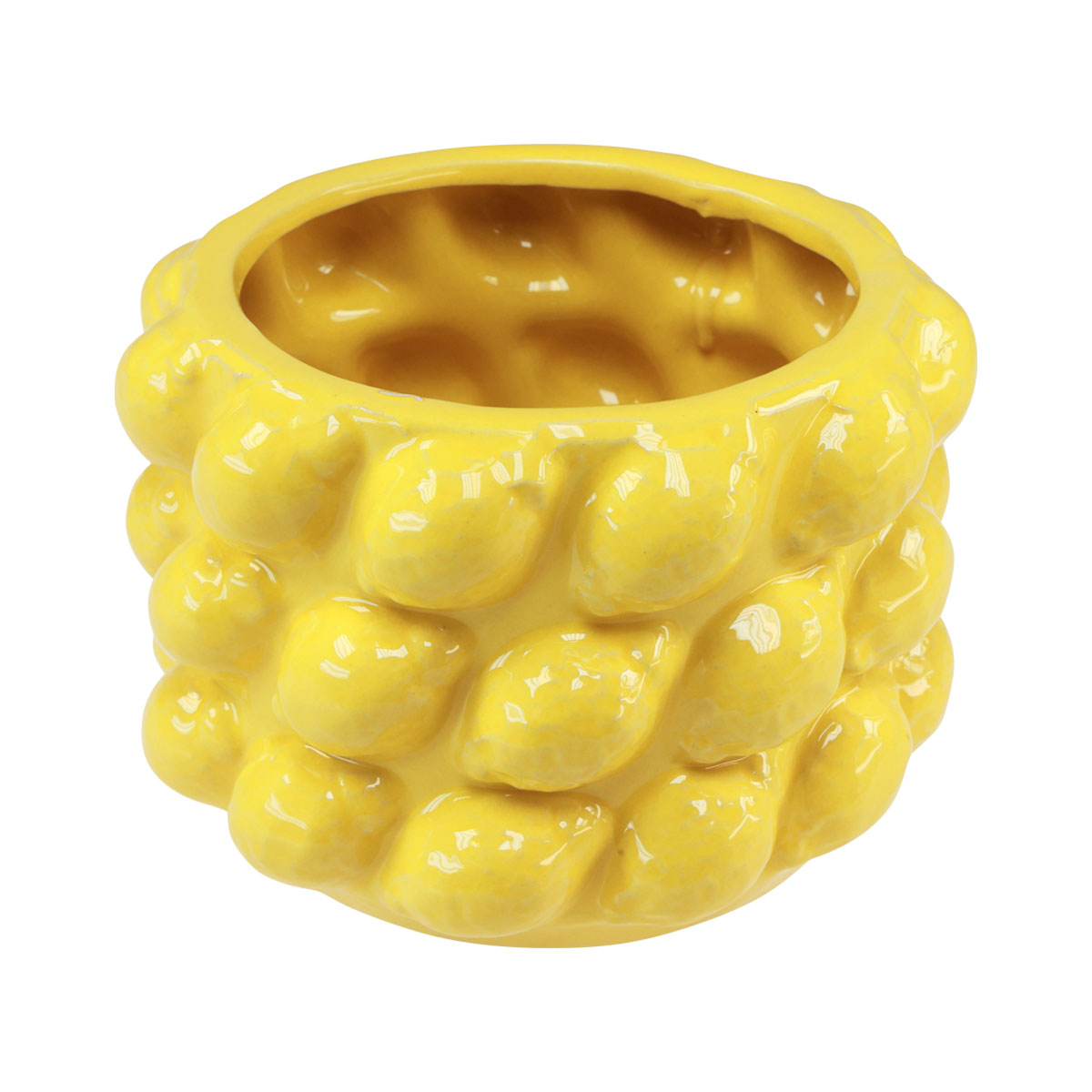 Jaune vernissé, ce vase citron unique rappelle immédiatement les agrumes méditerranéens. Le design sculptural de l'extérieur avec de nombreux petits citrons donne au pot une apparence vivante.
