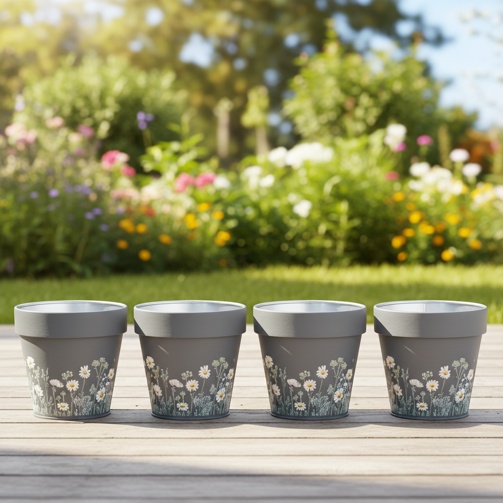 Ce pot de fleurs décoratif à motif de marguerite apportera une touche de fraîcheur à votre intérieur. Sur un rebord de fenêtre, une étagère du salon ou un bureau, son design gris discret s'intègre harmonieusement à tous les décors. Le charmant motif floral ajoute une note de nature et de joie de vivre à n'importe quelle pièce. Ce lot de quatre pots vous permettra de créer plusieurs oasis accueillantes. Pratique et léger, fabriqué en métal robuste, ce pot de fleurs est non seulement esthétique, mais aussi étonnamment polyvalent. Un petit bijou qui allie style et fonctionnalité !