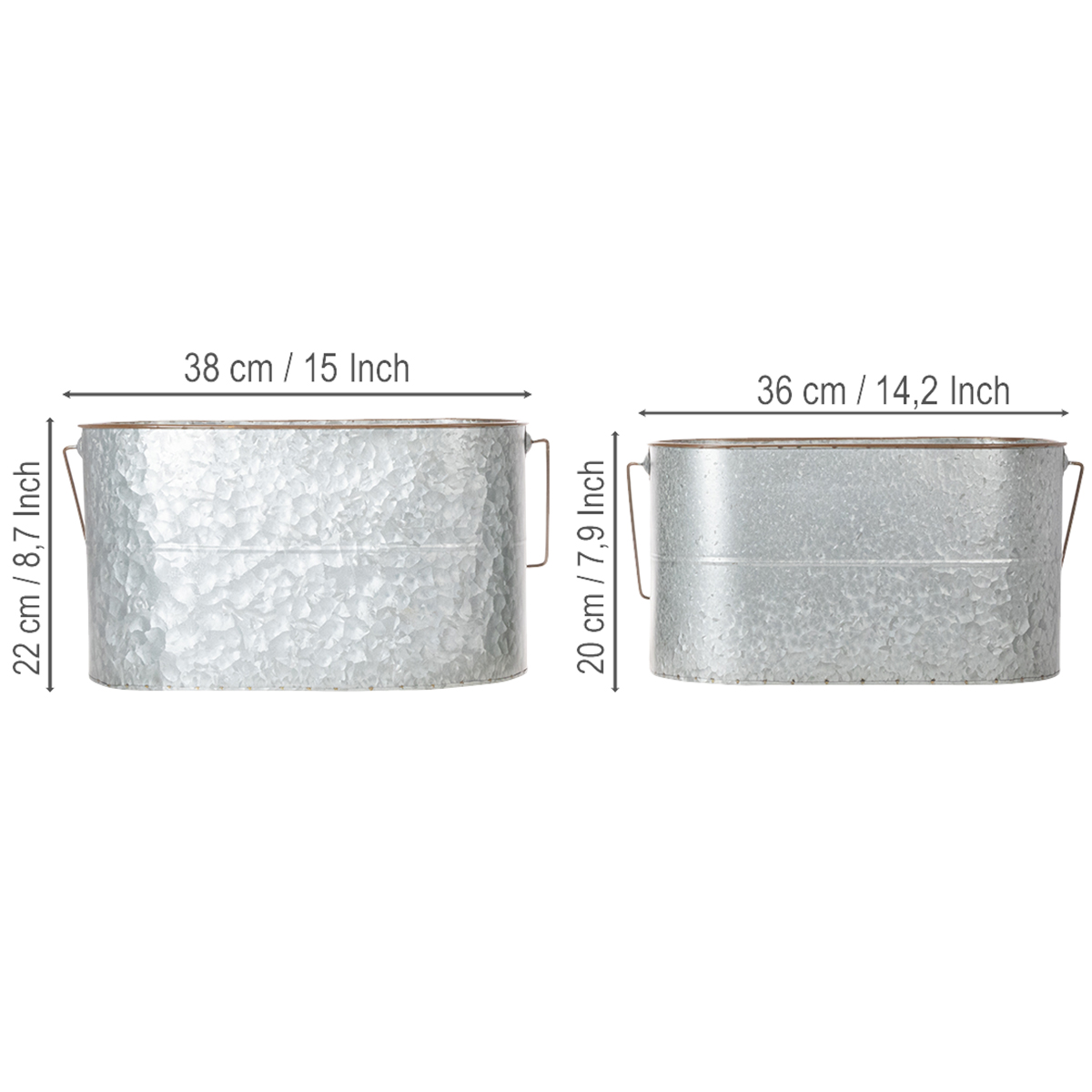 Pot de fleurs avec anse, pot en métal, jardinière, argenté, marron, H 22/20 cm L 42/40 cm, lot de 2