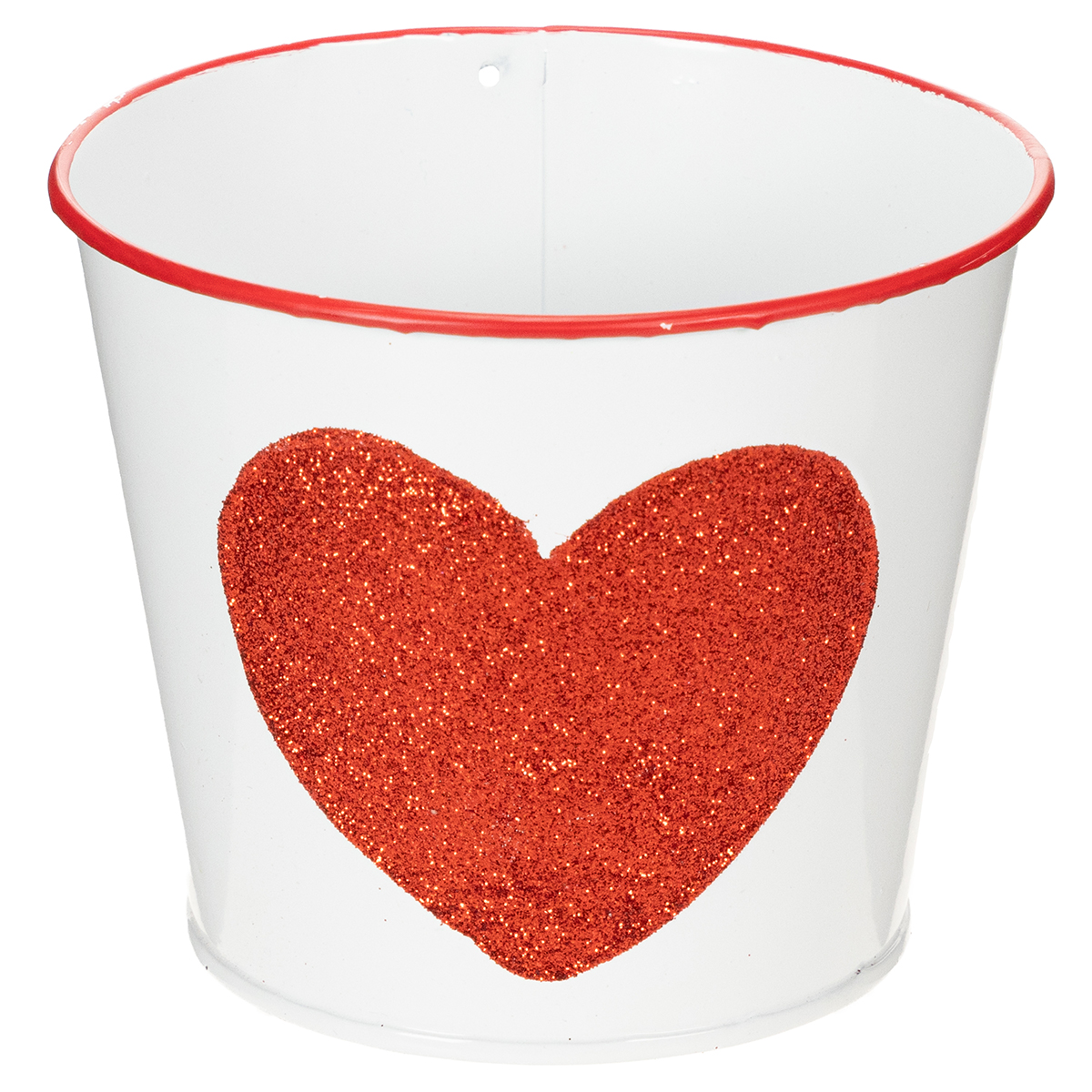 Un joli petit pot de fleurs au design classique. Le seau en étain blanc a la forme d'une tasse, a un bord rouge et une forme de cœur rouge.
