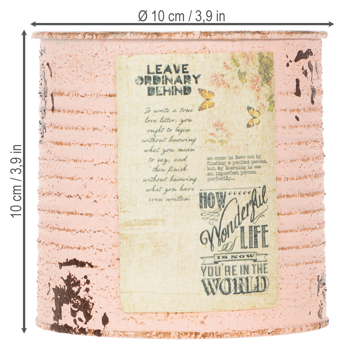 Le pot de fleurs fabriqué à partir d'une boîte décorative de couleur saumon pastel est au moins aussi atmosphérique qu'une véritable boîte de conserve vintage. Cependant, la décoration estivale en métal présente l'avantage décisif qu'il n'y a pas d'arêtes vives ici. De cette façon, vous pouvez planter la boîte de conserve sans aucun risque de blessure. Une teinte brun rouille émerge sous la couleur pastel brossée sur les rainures de l'étain. De plus, des taches de rouille peintes et une étiquette nostalgique soulignent le shabby chic de la canette rétro. L'intérieur du pot décoratif est conservé très simplement en argent.