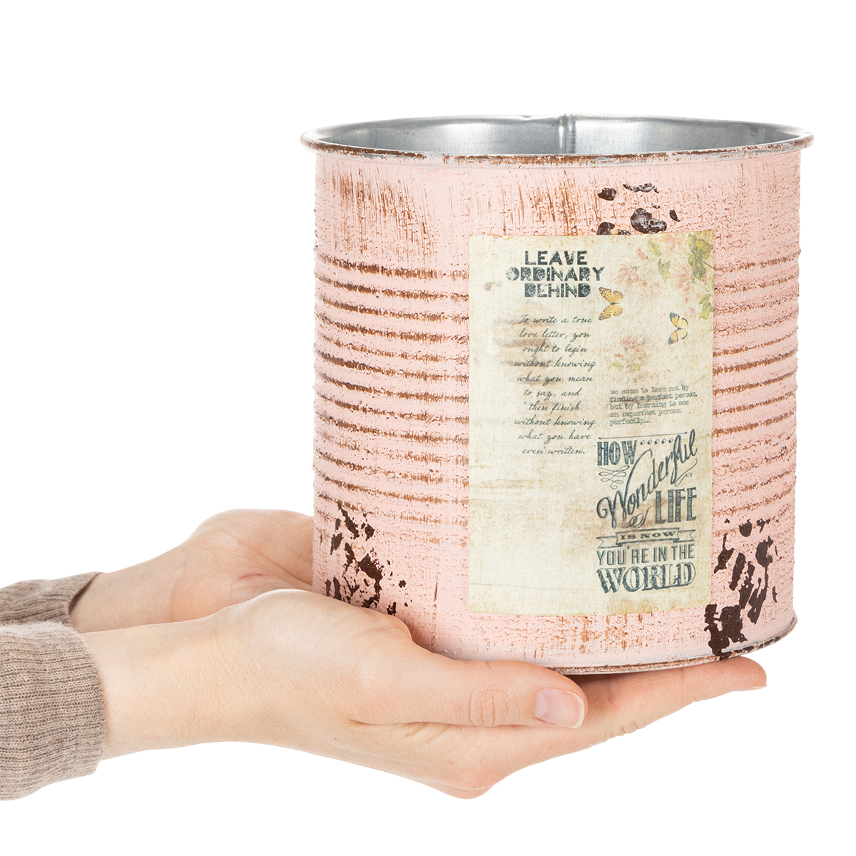 Ce pot de fleurs couleur saumon en boîte décorative rend l'été coloré ! Soigneusement peint avec un spray antirouille et une couleur pastel sélectionnée, le récipient en métal peut être utilisé comme cache-pot ou jardinière. Un autocollant vintage souligne l'aspect raffiné et nostalgique de la boîte de conserve. Le fait que la décoration en métal soit en fait toute neuve ne peut être vu que de l'intérieur argenté. Bien sûr, cette boîte, spécialement conçue comme jardinière, n'a pas d'arêtes vives à l'intérieur.