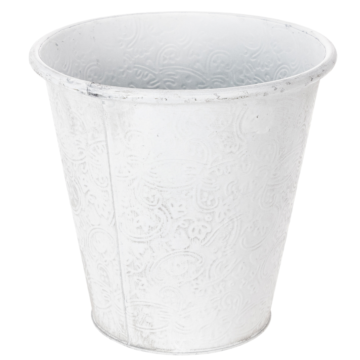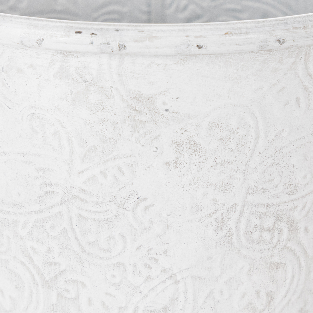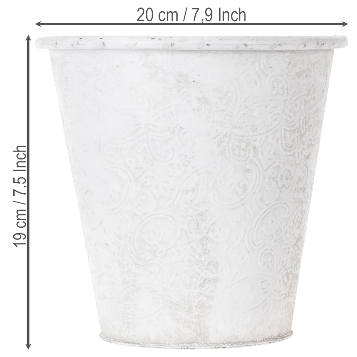 Le cache-pot de conte de fées est décoré d'ornements : La décoration en métal est embossée de fleurs florales tout autour. Avec son look romantique et son délavage blanc tendance shabby chic, la vasque en métal s'intègre également à merveille comme décoration de table dans un style vintage pour une décoration florale pour un mariage !