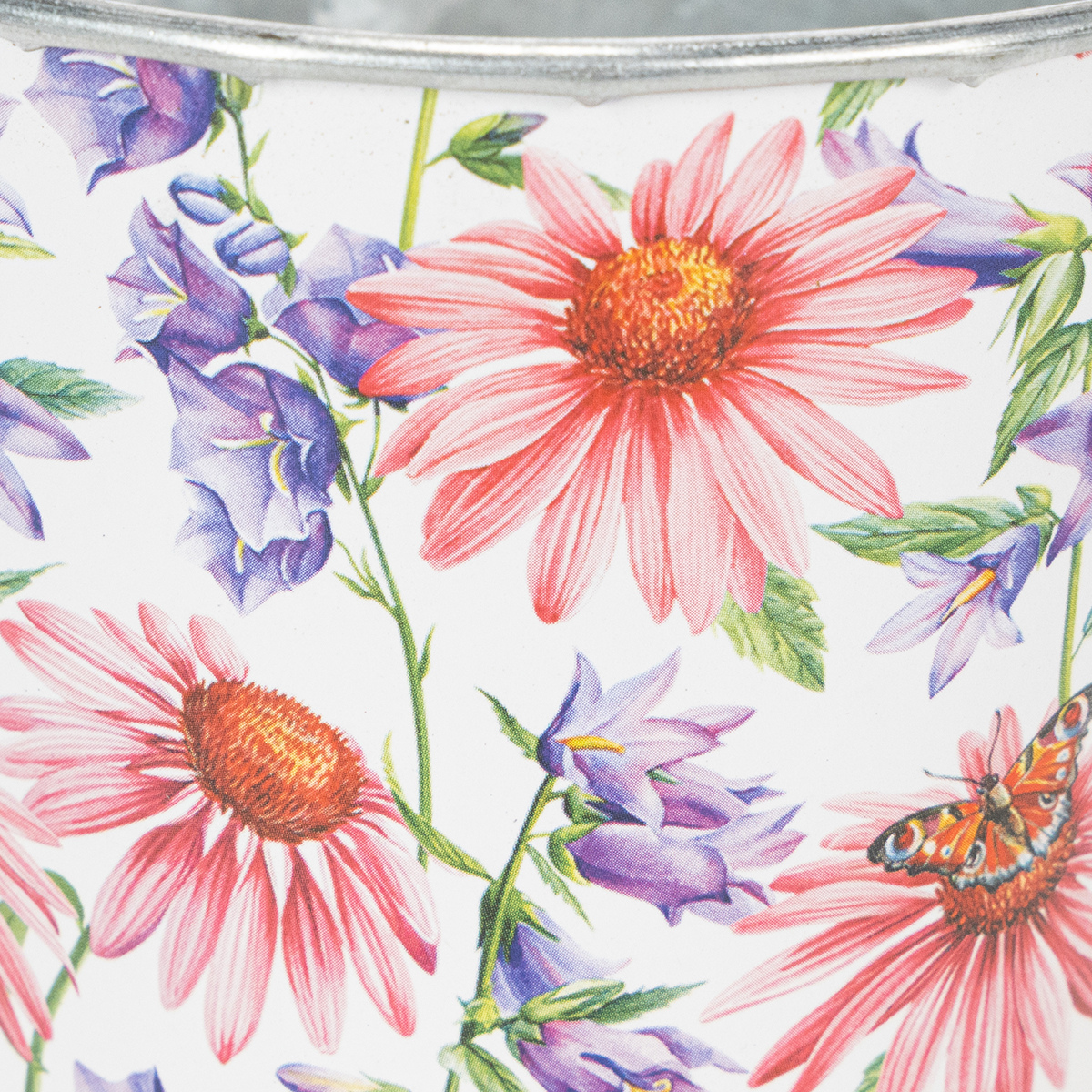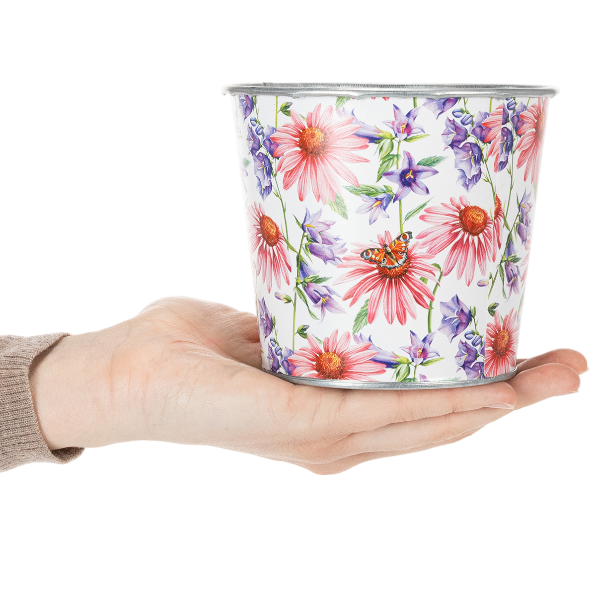 Le pot décoratif est galvanisé à l'intérieur et scintille en argent, tandis que l'autocollant enchanteur avec un imprimé printanier sur fond blanc se trouve à l'extérieur. Le pot s'élargit un peu vers le haut. Lors de la plantation, il est conseillé de tapisser la jardinière de papier d'aluminium et de créer une couche drainante de gravier ou d'argile. Cela signifie que l'humidité n'endommage pas la plante ou la jardinière.