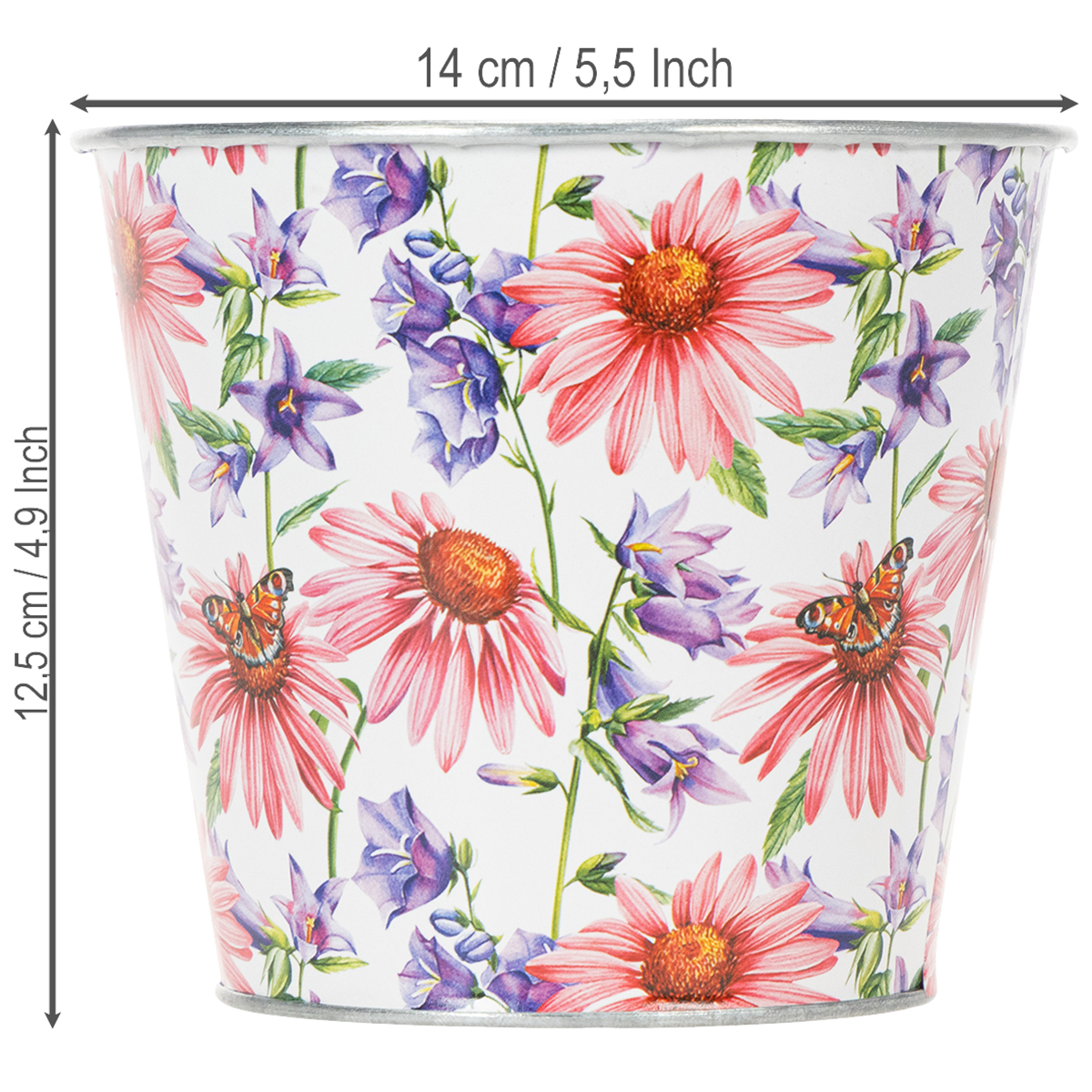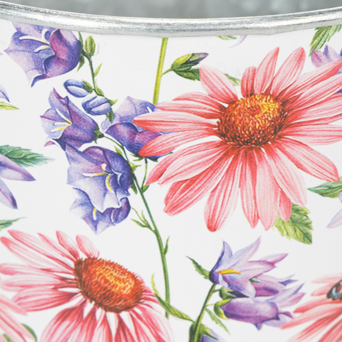 Alors que l'imprimé floral est très précisément collé à l'extérieur, l'intérieur du pot et les bords brillent dans le plus beau zinc argenté. Pour une plantation directe dans le pot, nous conseillons un film qui protège l'intérieur de l'humidité.