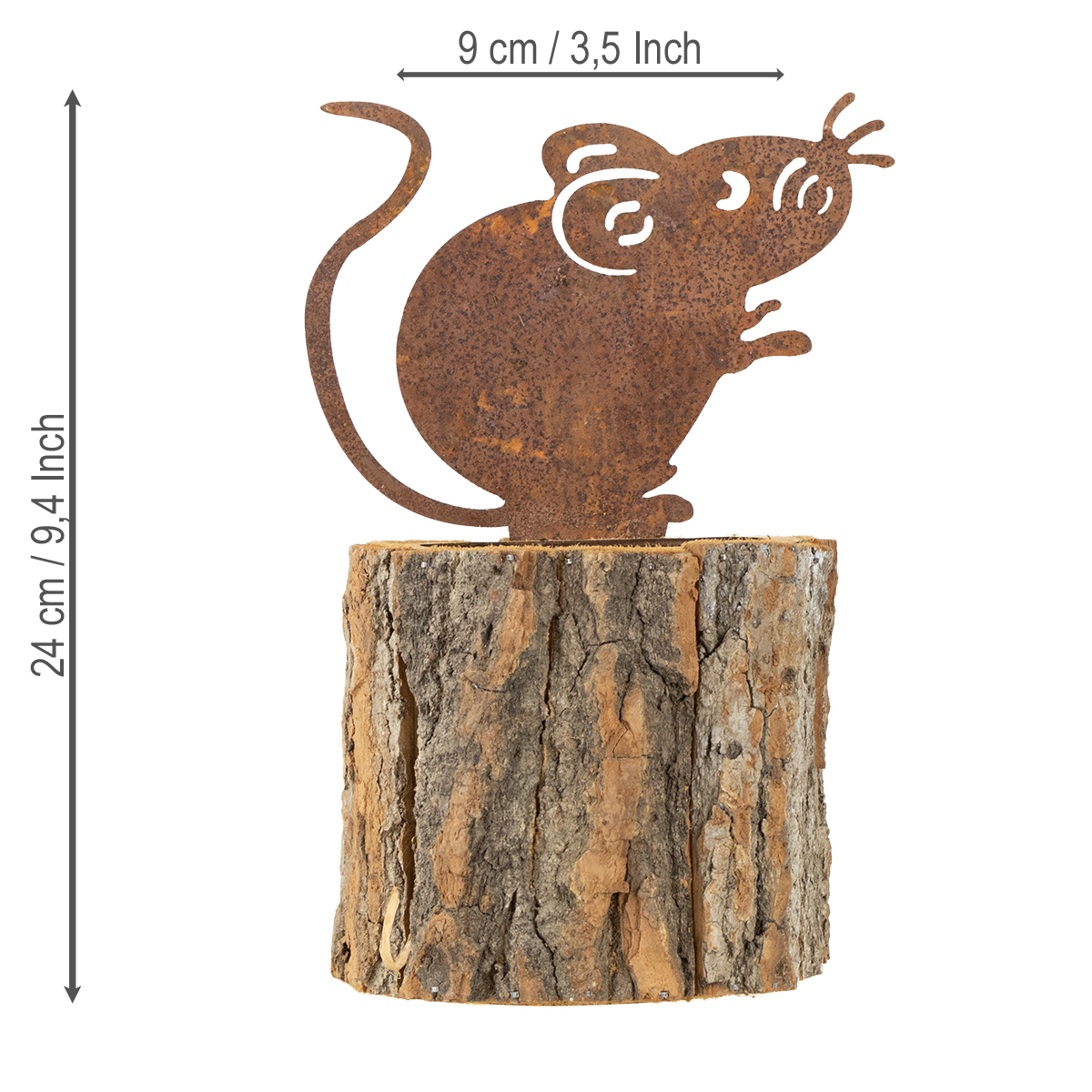 Sur le bord se trouve une souris en tôle qui est recouverte d'une magnifique patine de patine. L'ouverture au sommet consiste en un anneau en bois à travers lequel différentes plantes peuvent être insérées.
