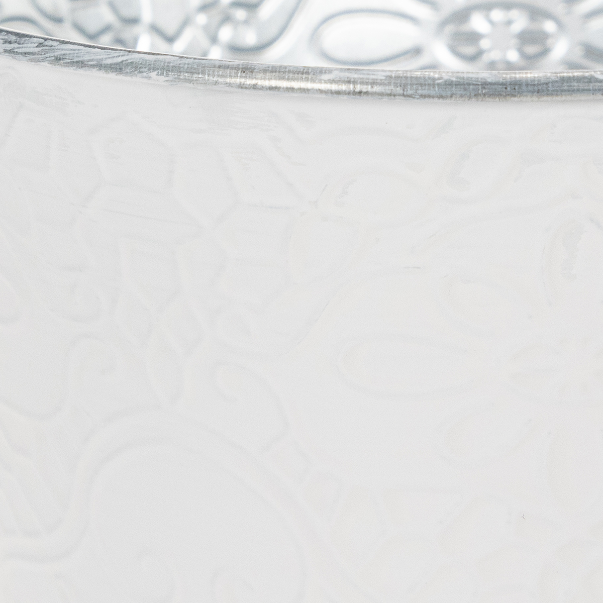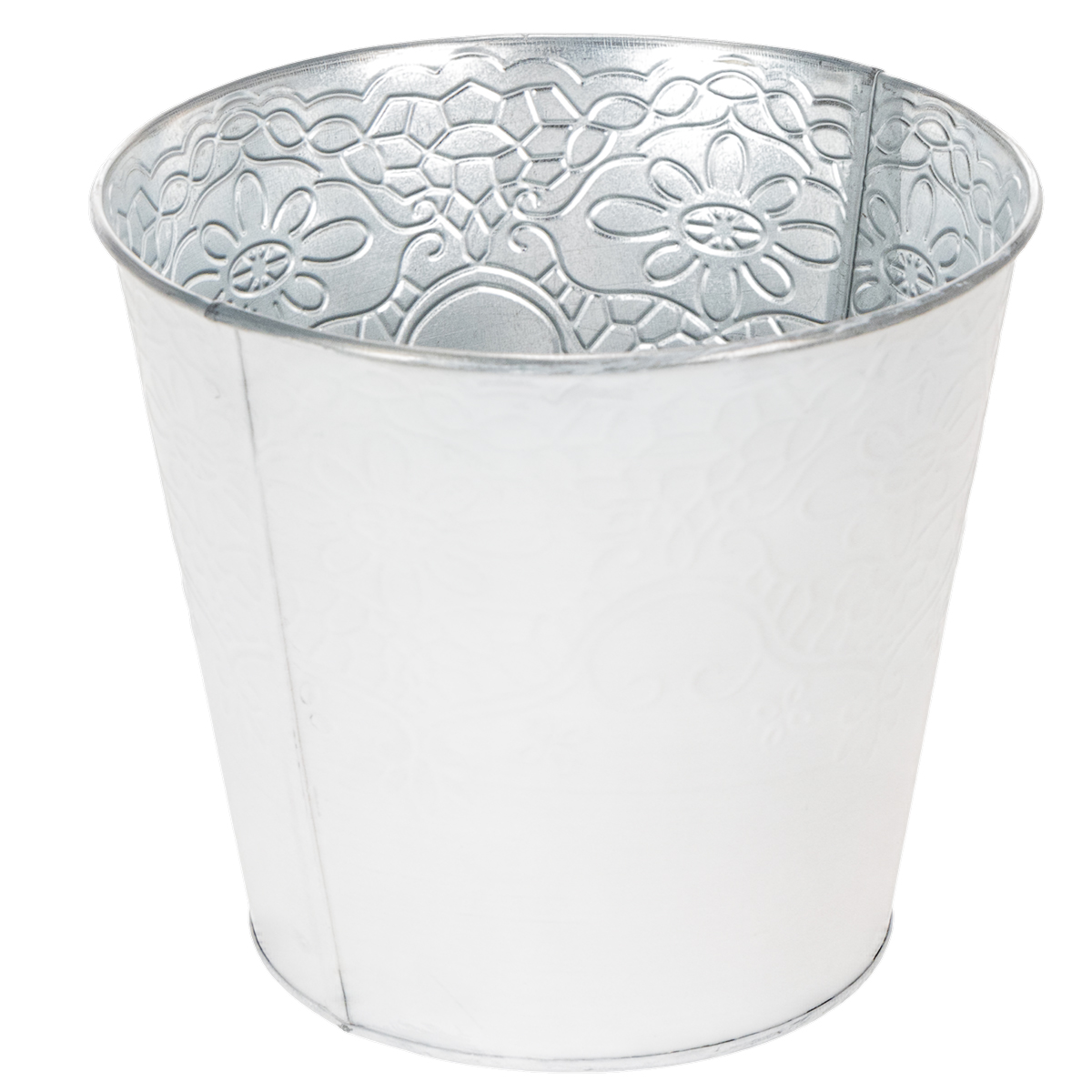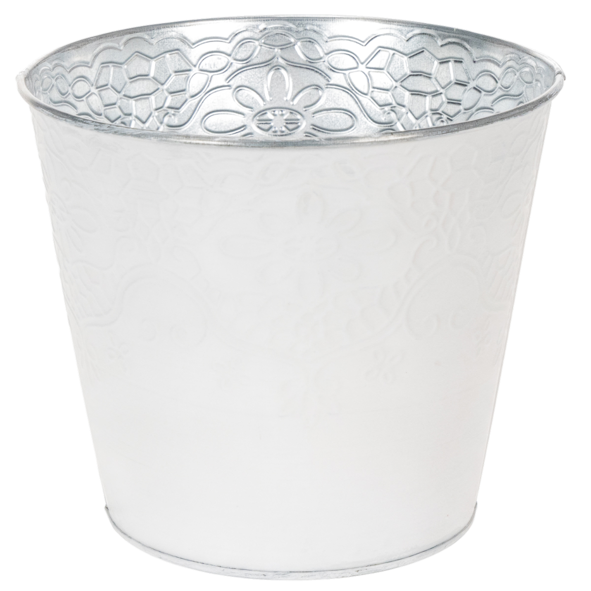Un motif détaillé de vrilles et de fleurs orne la jardinière en métal comme un gaufrage. En combinaison avec la peinture blanche pastel à l'extérieur, cela crée un cache-pot merveilleusement nostalgique pour le printemps !