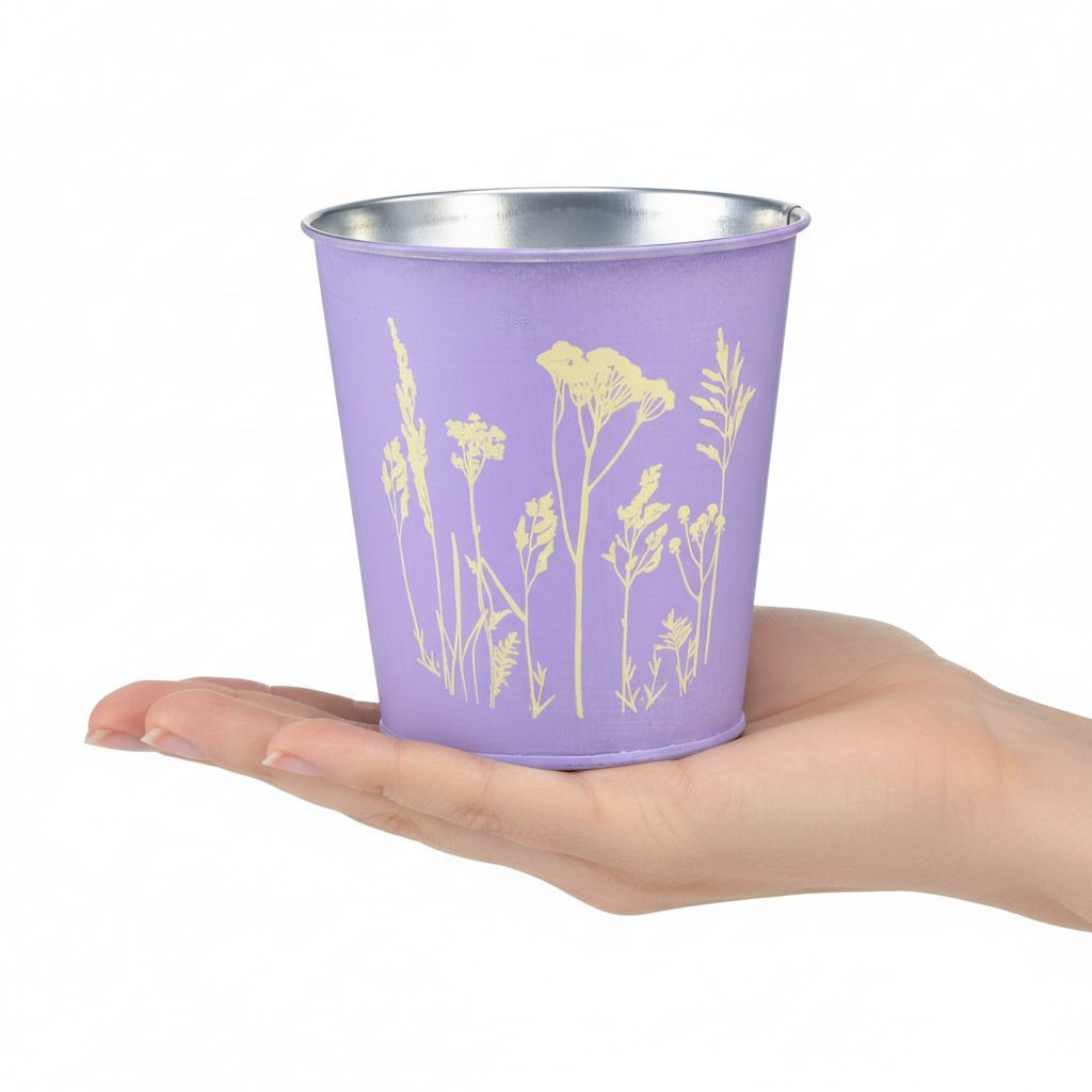 Placez un pot de fleurs dans le pot en métal et offrez une nouvelle maison aux marguerites et autres fleurs des prés avec le pot de fleurs. Le pot en métal est décoré sur un côté du motif floral jaune, qui fait scintiller la couleur du pot de couleur lavande comme un jaune doré mat.