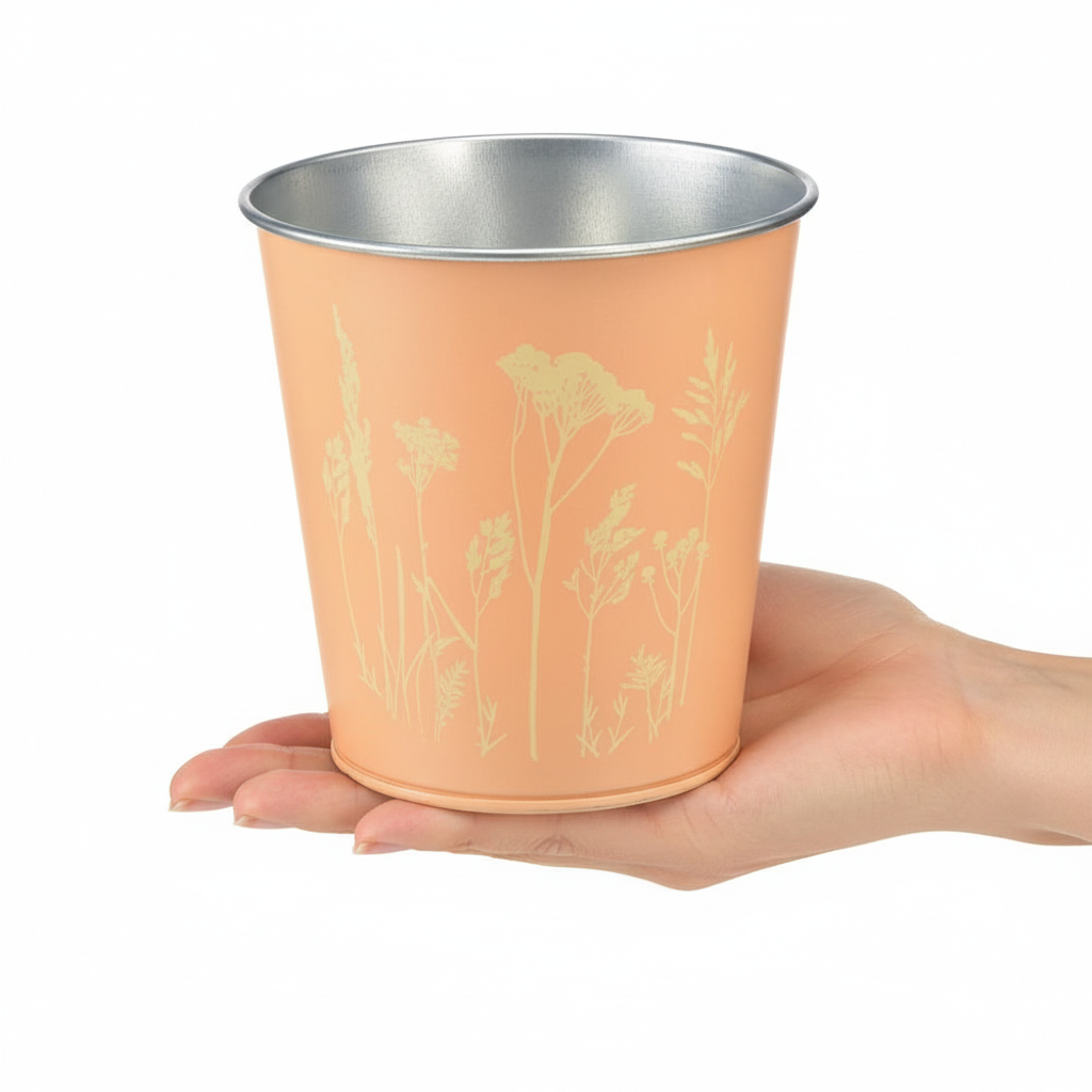 Vous recevrez la jardinière en métal de couleur pêche avec un motif jaune doré décoré sur un côté. Le sol intérieur scintille d'argent et vous invite à l'équiper et à le planter.