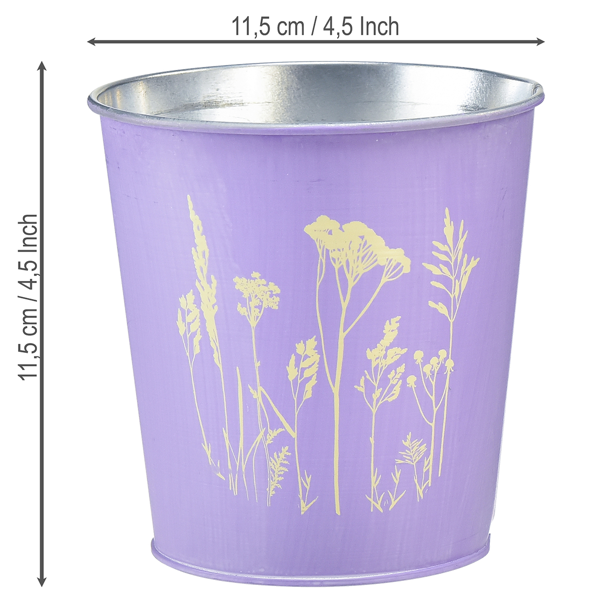 Ce pot de fleur en métal est décoré d'une prairie fleurie. Les fleurs des prés apparaissent sur le pot violet avec des reflets dorés.