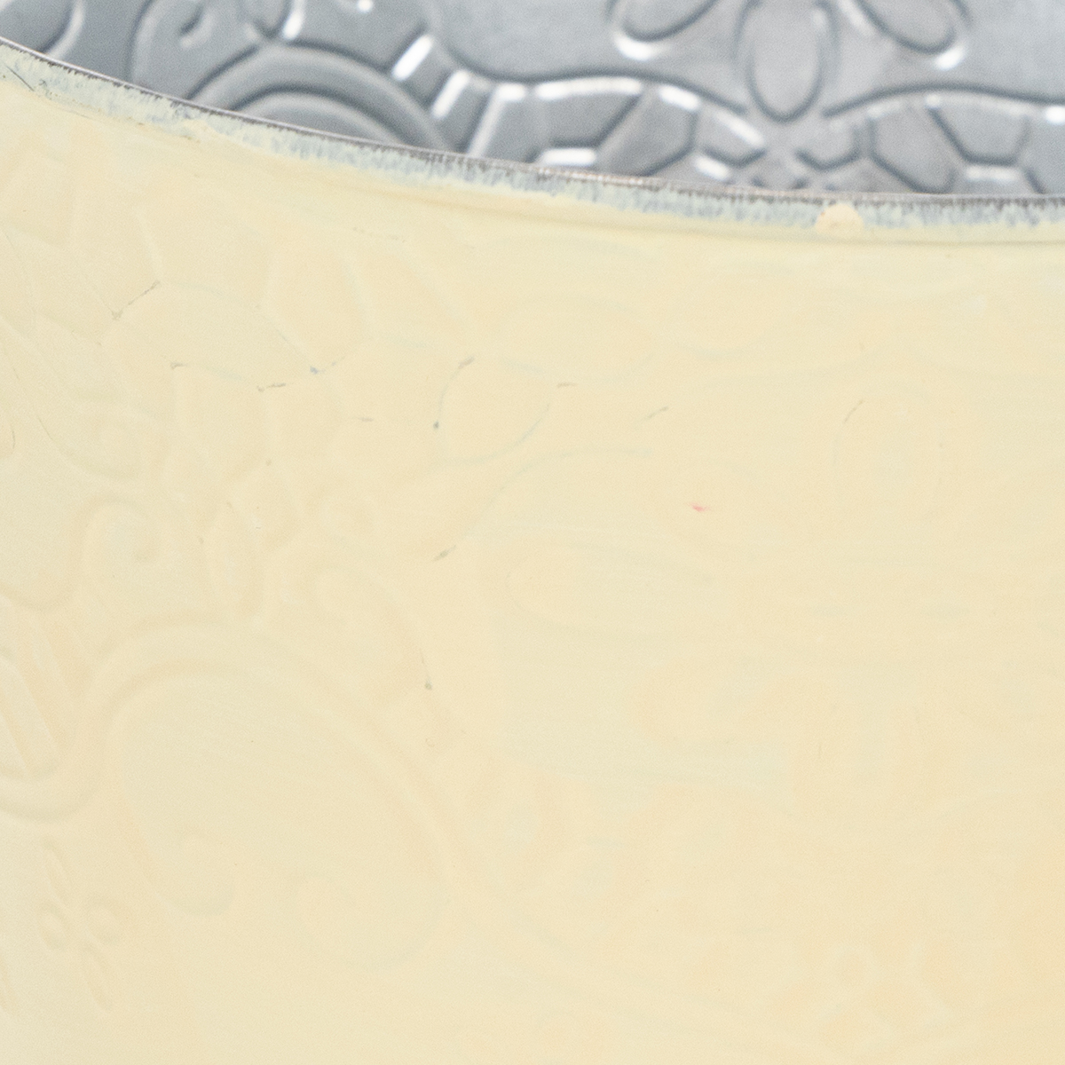 La décoration en métal de haute qualité est ornée d'un motif floral en relief plein de rétro chic et peint en jaune vif à l'extérieur avec des coups de pinceau apparents. Les fleurs et les vrilles sur le pot de fleurs rappellent