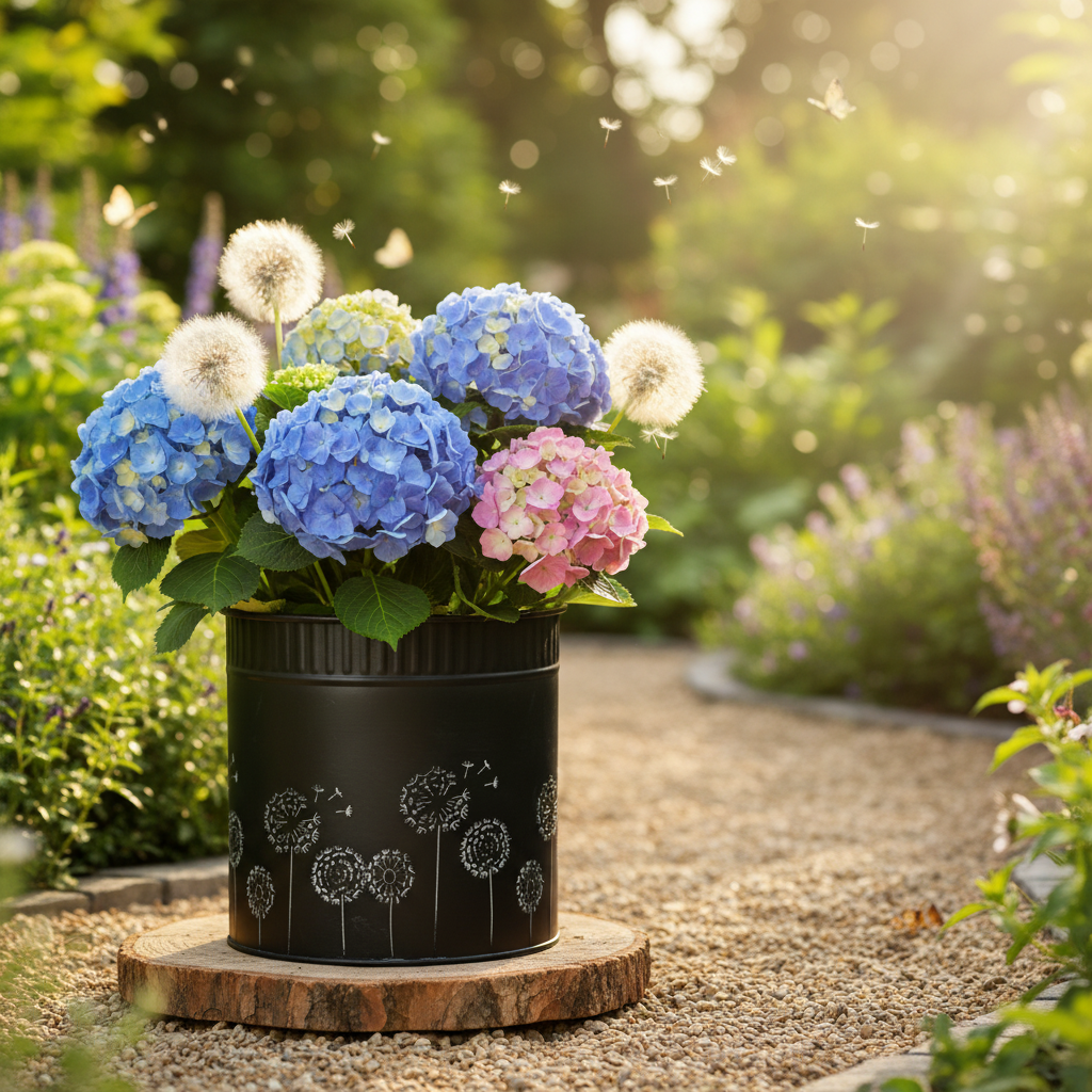 La jardinière aux pissenlits donne aux fleurs et compositions un aspect original dans les décorations estivales. Mais le pot de fleur noir peut également offrir un cadre privilégié à une petite plante verte.