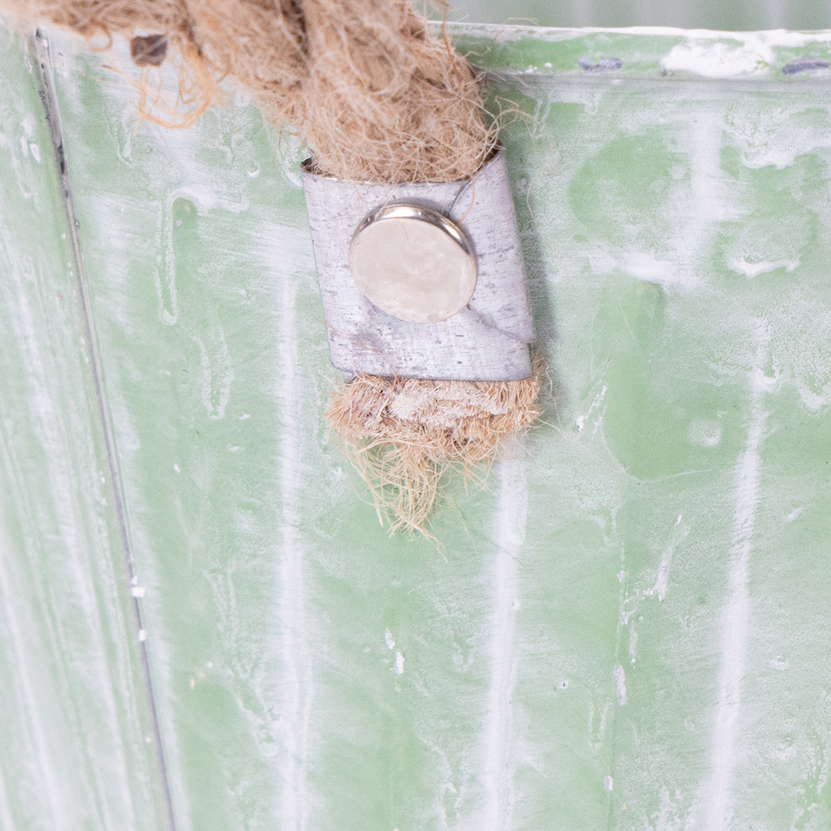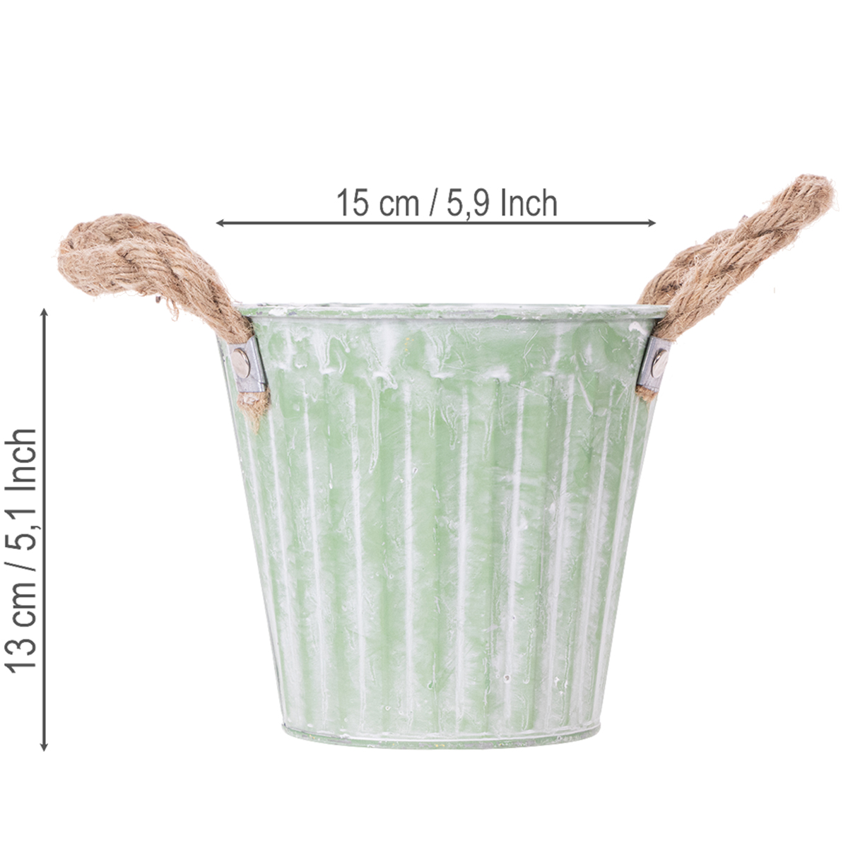 Le pot de fleurs est muni de poignées en corde de jute et a été blanchi à la chaux. Le bac est orné d'un motif uniforme de rayures verticales en relief. Le blanchiment des pots crée un joli contraste avec les tons pastel rose, vert et jaune des contenants en métal, faisant ainsi ressortir davantage le motif de la décoration métallique !