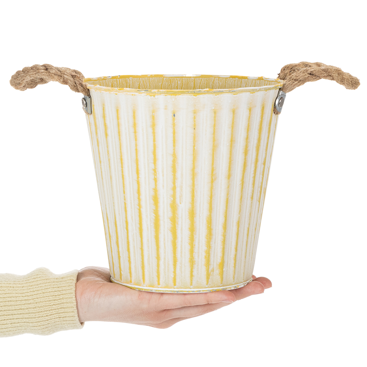 Ce pot en métal est parfait pour les décos printanières : en jaune pastel, la jardinière aux anses en corde de jute se décline en blanc lavé dans un esprit shabby chic tendance.