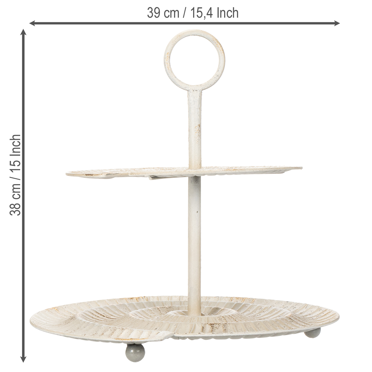Que ce soit pour un café entre amis, une fête de famille ou simplement au quotidien, la présentation soignée des desserts, pâtisseries et autres gourmandises fait toute la différence. Avec ce présentoir à desserts en métal au charme vintage, vous apporterez à votre table élégance et organisation. Ce présentoir à deux étages séduit par son design raffiné et sa couleur blanche, qui s'intègre parfaitement dans un décor shabby chic. Un véritable atout pour votre salon ou votre cuisine !