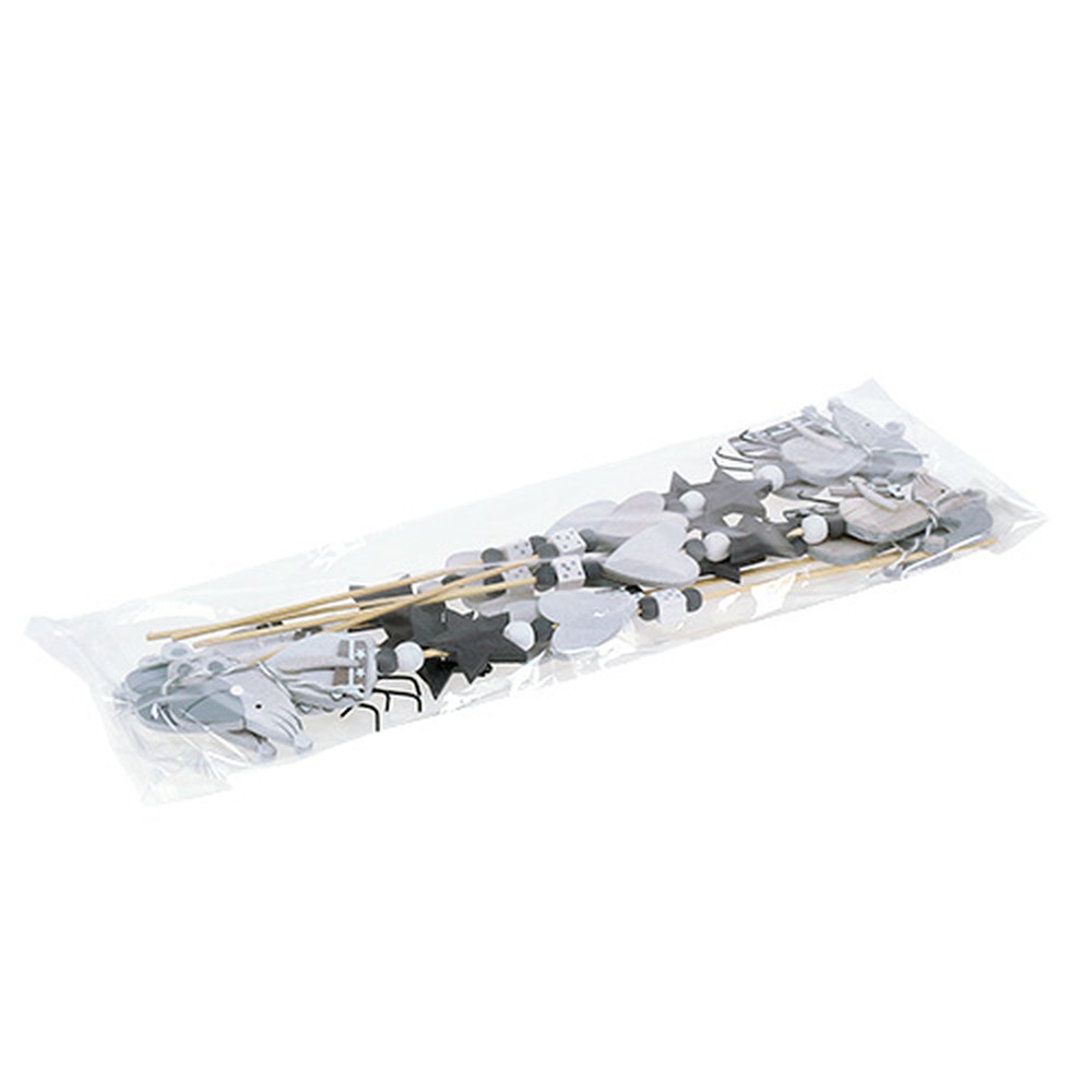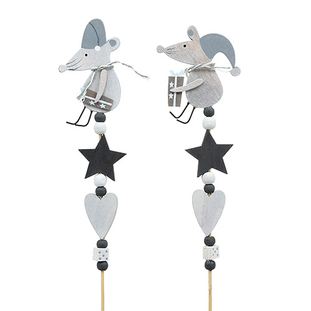 Souris mignonnes avec un chapeau pointu - où est-ce? Chez Floristik24 bien sûr! Cette prise en bois décorative a une souris grise sur son dessus, porte un bonnet de Noel et porte jadis joyeusement un paquet-cadeau et une fois que le paquet tient assez simplement sous le bras et se promène. En outre, les deux variantes portent un fil blanc-gris comme écharpe et de petites pattes en métal noir. Parmi les figurines de Noël, il y a encore plusieurs perles de bois grises et blanches ainsi qu’un cœur, un poinsettia et un cube.La partie inférieure du bâton est complètement découplée afin que vous puissiez facilement tout mettre dans le sol de vos fleurs en pot. Ainsi, vous pouvez même décorer vos plantes avec des décorations de Noël pendant la saison de l'avent. Vous pouvez également mettre les bouchons de bois dans un bouquet et dans l’arceau d’un paquet cadeau.