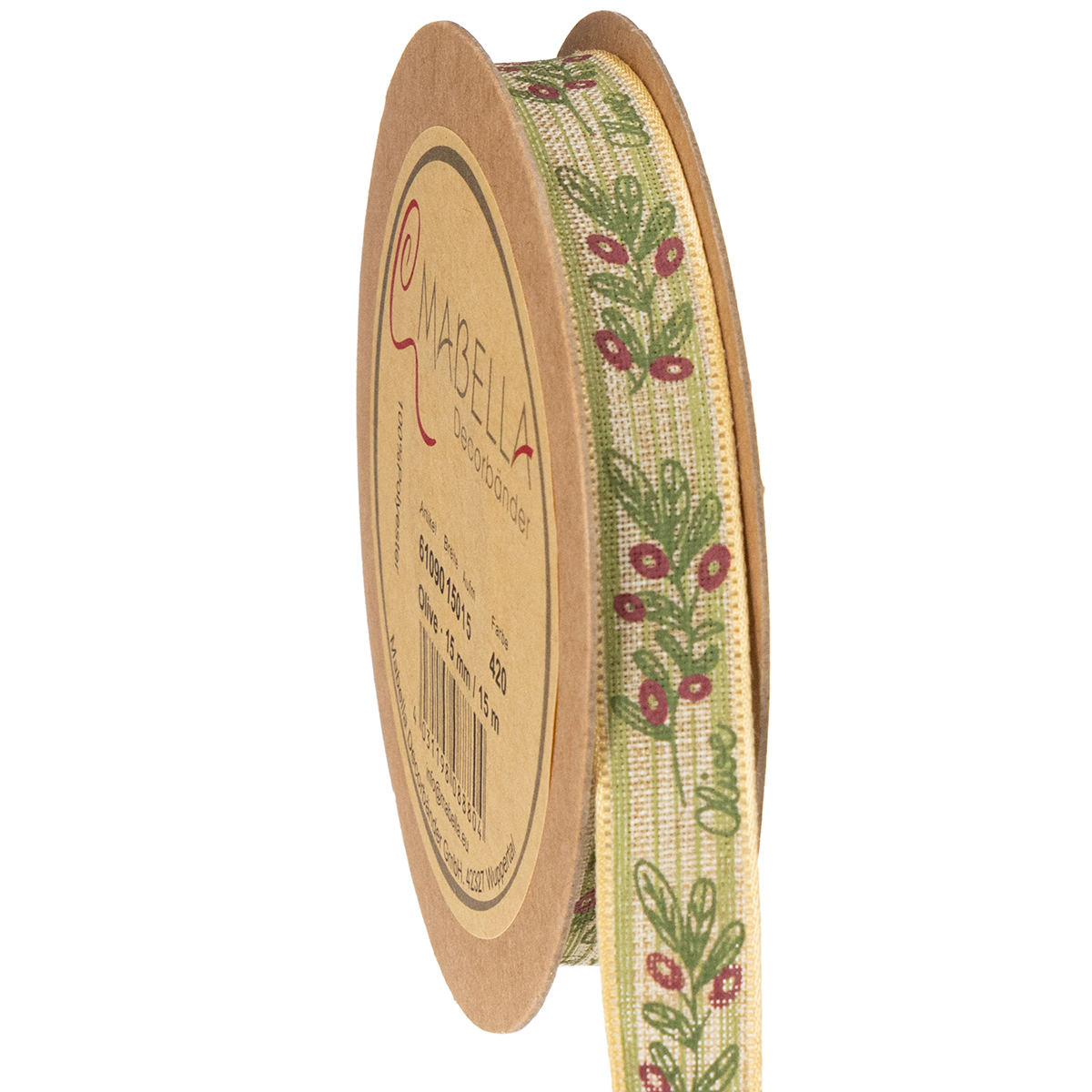 Ruban cadeau branche d'olivier avec branches et olives élégantes, 1,5 cm, 15 m