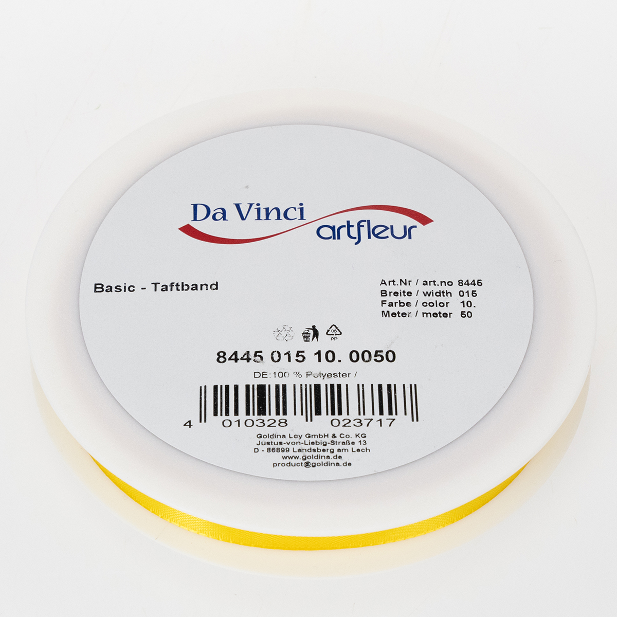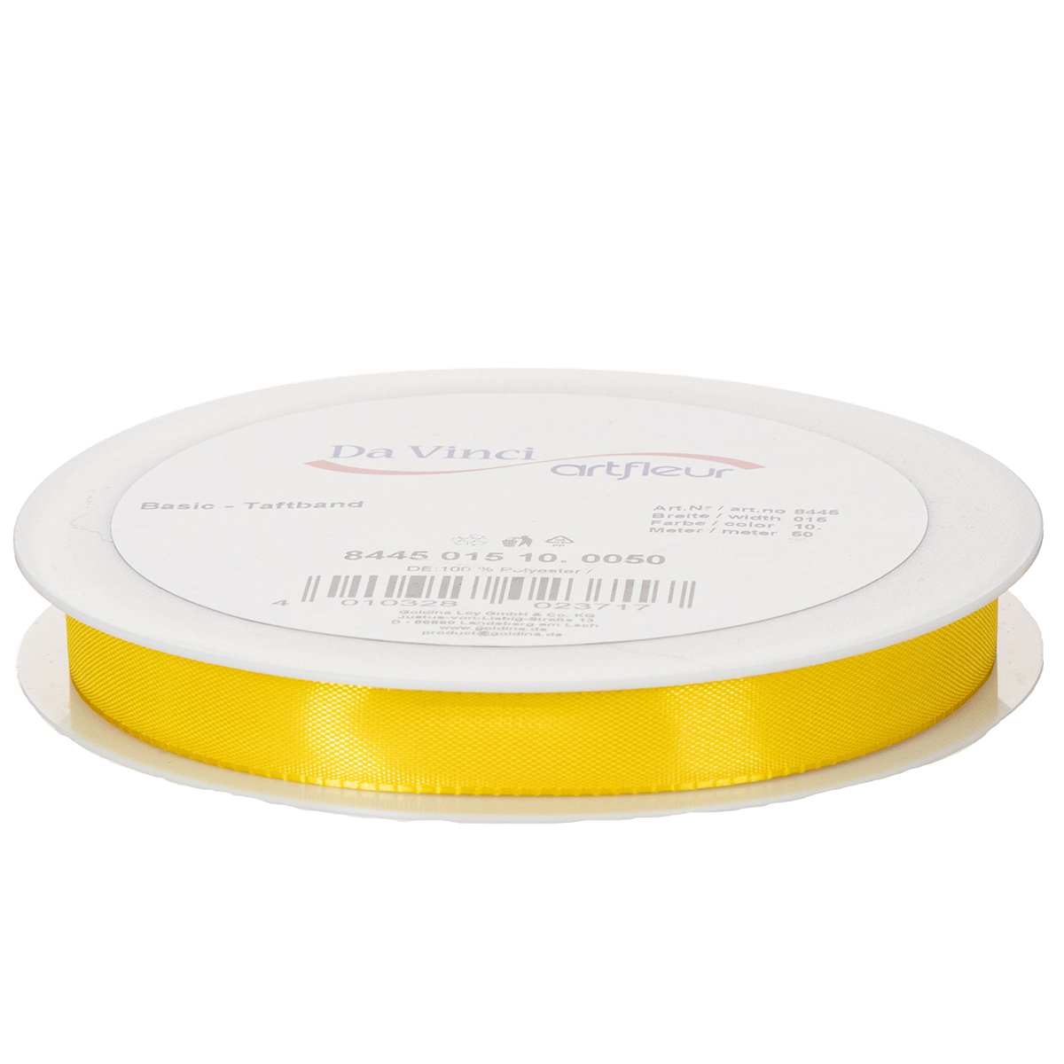 Le ruban jaune, idéal pour les cadeaux et la décoration, est 100 % polyester. Il mesure environ 15 millimètres de large et 50 mètres de long. Il est enroulé sur une bobine en plastique pratique.