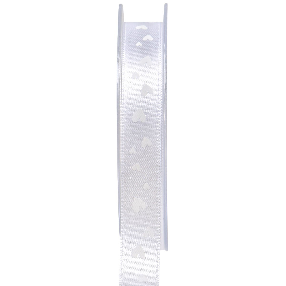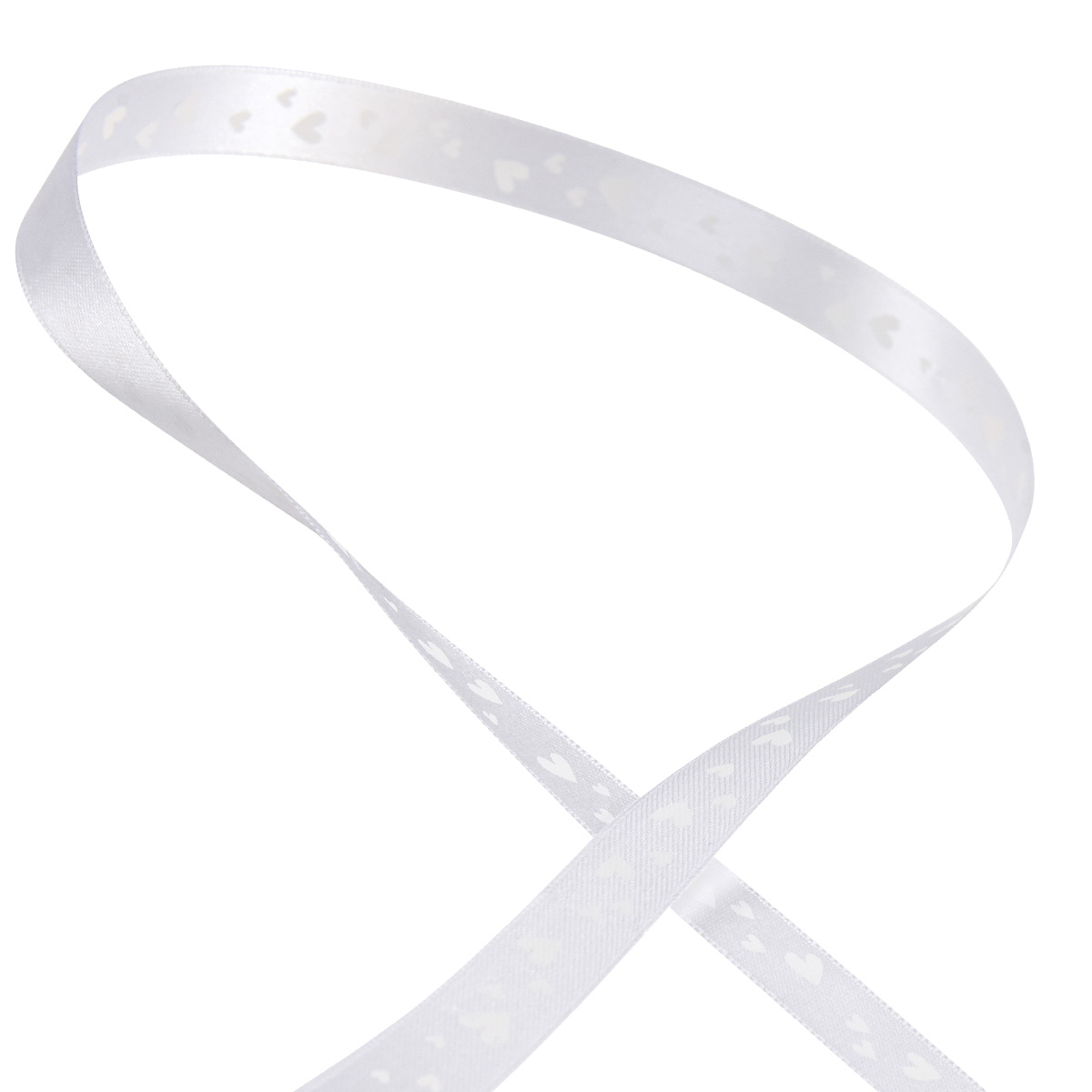 Le ruban en polyester brille d'un blanc soyeux et est imprimé de façon romantique avec des cœurs blancs. Les bords cousus complètent le ruban décoratif et lui confèrent une stabilité supplémentaire.