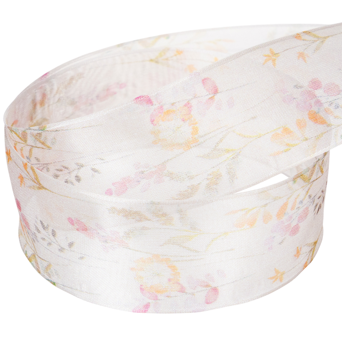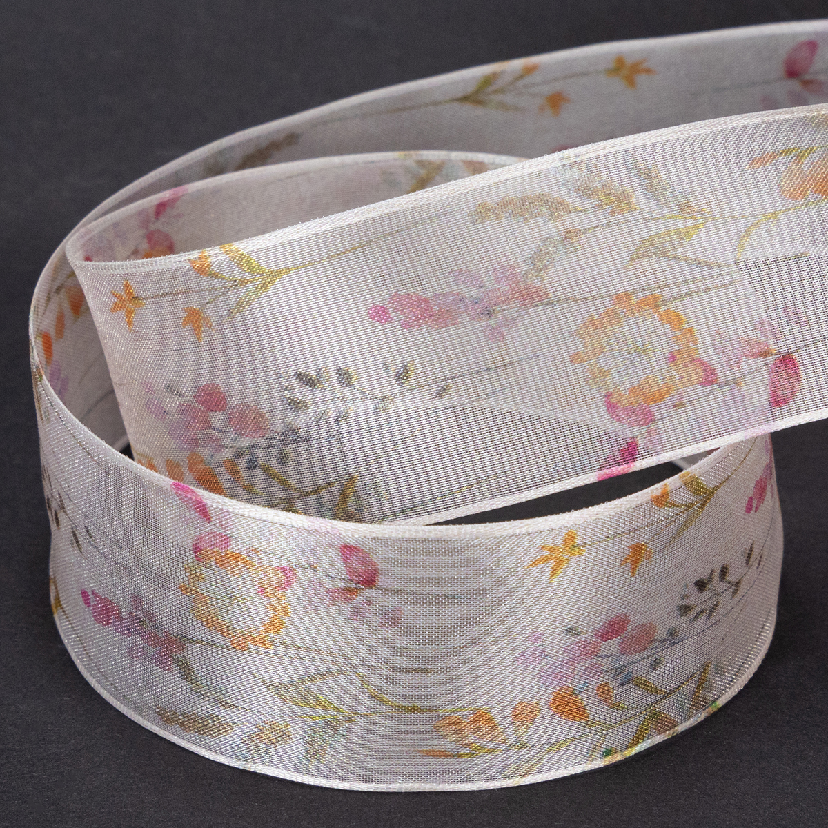 Avec les reflets soyeux typiques du tissu organza et la subtile palette de couleurs entre rose, abricot et orange, les motifs floraux et végétaux semblent provenir d'un jardin japonais. Aussi parfumé et délicat que soit le ruban, ses bords indéformables vous permettent de nouer des nœuds exactement comme vous l'espériez !