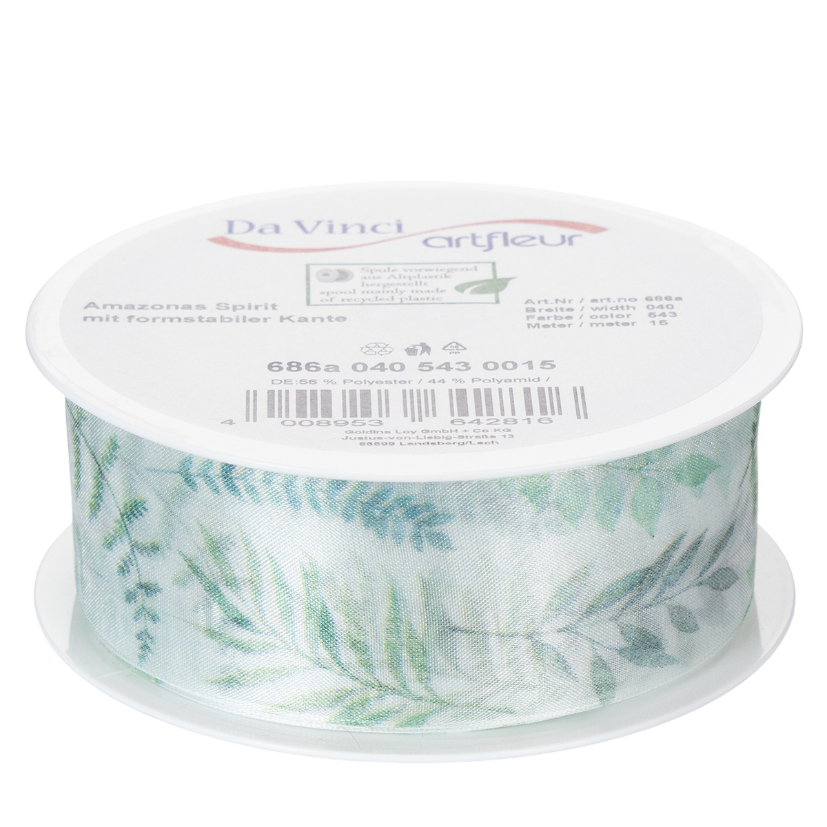 Différents motifs végétaux et feuilles dans de subtiles nuances de vert font de ce bandeau un accessoire particulièrement élégant. Avec son tissu organza transparent, le ruban en mousseline donne à vos décorations légèreté et brillance, tandis que le bord indéformable garantit que les nœuds s'ajustent toujours parfaitement.