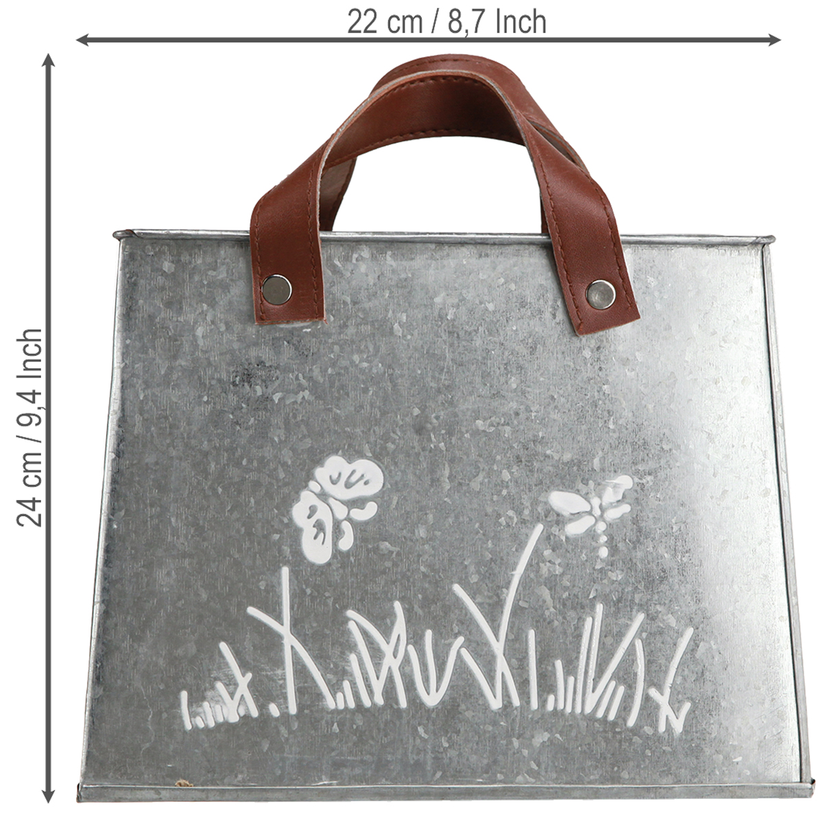 Nos sacs décoratifs en métal argenté allient fonctionnalité et design d'une manière extraordinaire. Ces jardinières sont idéales pour les décorateurs, les esprits créatifs et tous ceux qui cherchent à ajouter une touche d'élégance à leur maison. Avec un motif blanc de papillons et d'herbes des deux côtés et des poignées en simili cuir marron, vous obtenez un produit qui convient aussi bien comme pot de fleurs que comme élément décoratif pour le balcon ou la table. Ce sac à plantes décoratif met en valeur le charme rustique et se marie à merveille avec d'autres décorations vintage. Donnez à votre maison une touche personnelle avec ces extraordinaires pots de fleurs en métal qui impressionnent par leur élégance simple et intemporelle.
