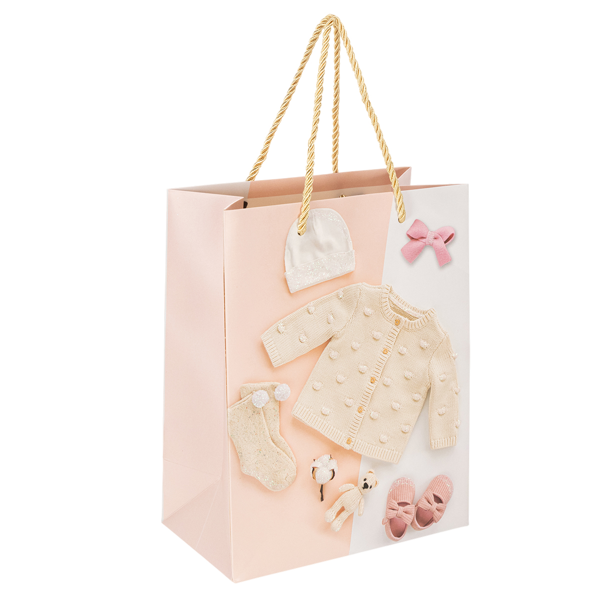 Les sacs cadeaux ont un design varié avec des cardigans, des chaussons, des biberons et bien d'autres accessoires mignons pour bébés. Les effets pailletés sur les sacs en papier mettent en valeur les détails et apportent une magie supplémentaire à votre emballage cadeau.