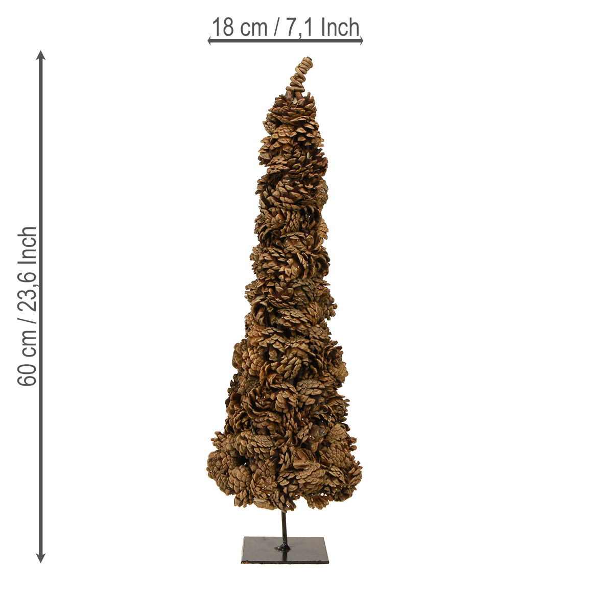 Les cônes naturels sont soigneusement disposés pour donner au sapin une forme harmonieuse. Le socle noir robuste assure sa stabilité tout en s'intégrant discrètement à l'ensemble. Cette décoration de Noël est idéale pour ceux qui apprécient les styles simples, élégants et naturels.