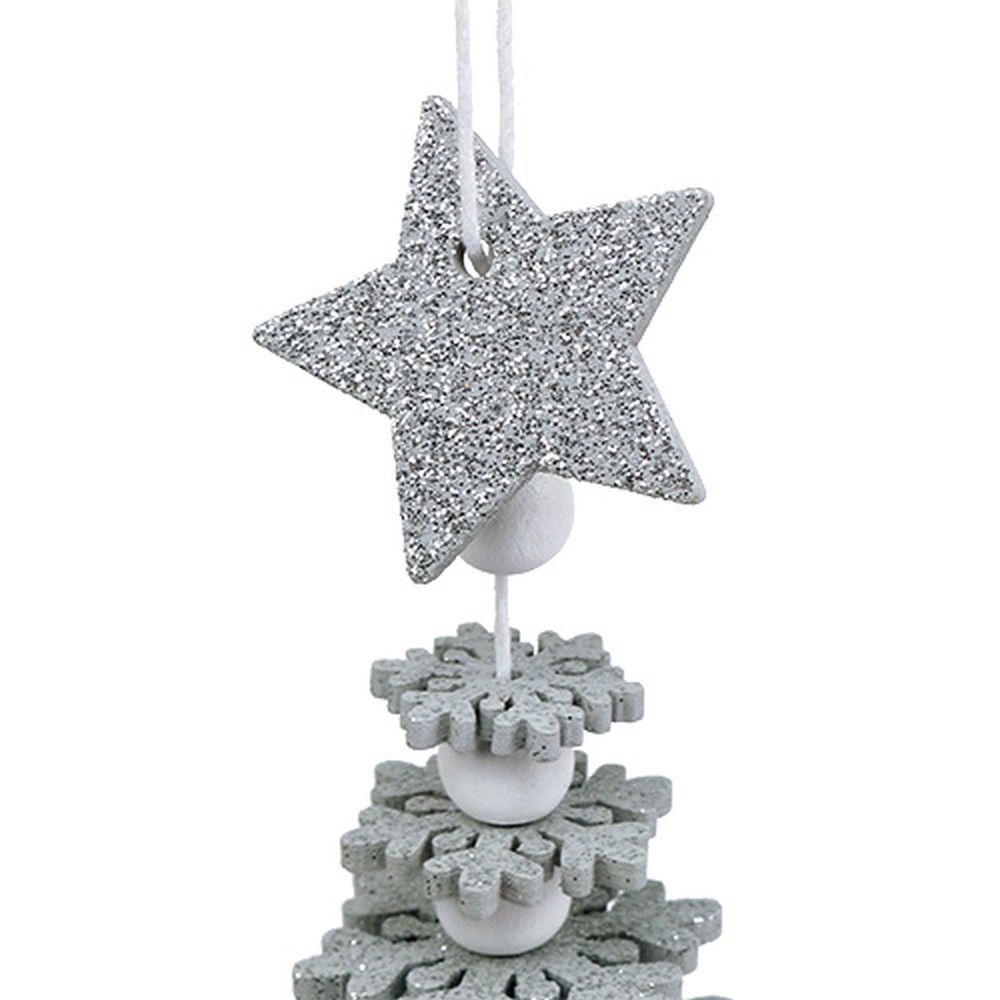 Une idée de décoration fantastique pour les fenêtres du salon à Noël! Cet arbre à suspendre en argent fournit avec la petite cloche en bas pour un beau son. Vous pouvez donc l’utiliser comme carillon et l’accrocher sur la terrasse ou sur votre balcon. Mais même dans le hall, l’arbre de décoration est une belle figure et peut également être très bien combiné avec d’autres décorations de Noël, telles que des étoiles.En raison du mica d'argent qui a été saupoudré sur les disques en bois individuels et de l'étoile en bois au sommet, l'arbre de décoration est particulièrement noble et peut donc être utilisé de manière appropriée pour une fête de Noël.
