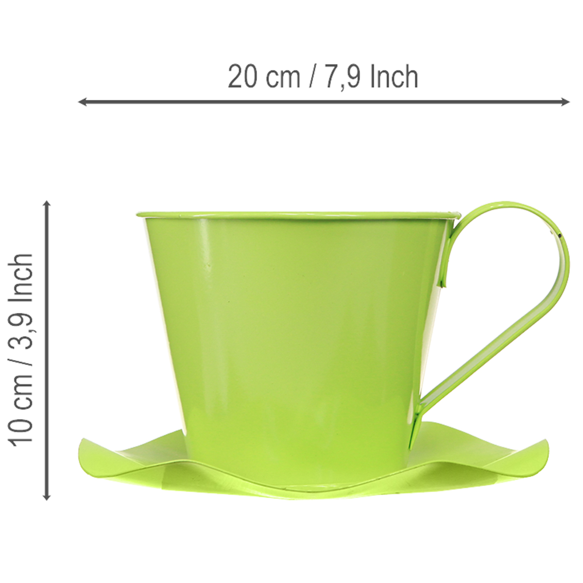 Ajoutez une touche fraîche et vivante à vos pièces avec notre tasse décorative en métal vert pomme clair. Cette tasse à thé décorative combine un design classique avec des accents modernes et vous offre des options de conception créative infinies. La tasse en métal vert clair est fixée sur une soucoupe en forme de fleur et impressionne par son aspect élégant. Avec un diamètre d'environ 12 centimètres pour la tasse et environ 18 centimètres pour la soucoupe et une hauteur d'environ 10 cm, il convient parfaitement à de nombreux usages décoratifs. Que ce soit pour ranger de petits objets, comme décoration de table élégante pour des occasions spéciales ou comme mini pot de fleurs pour vos plantes préférées, les utilisations possibles sont diverses. Découvrez les joies de la décoration avec cette charmante tasse à thé en métal qui ajoutera une touche spéciale à n'importe quel endroit.