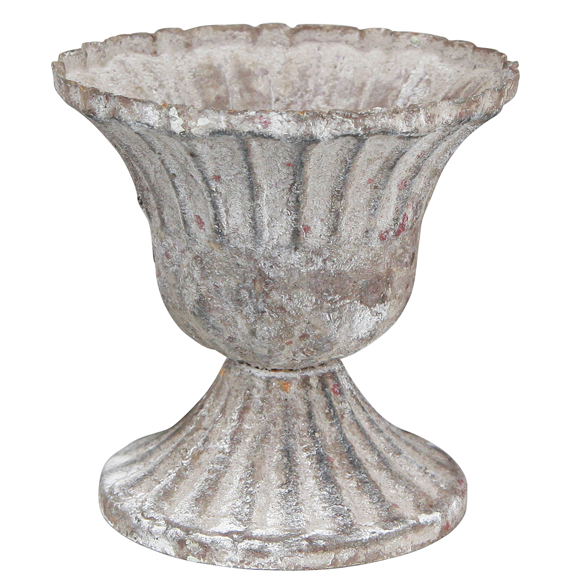 Le gobelet antique en gris, rouille et blanc est en métal et a un diamètre d'environ 8 centimètres au bord supérieur ; le diamètre de la base est d'environ 7 centimètres. La hauteur totale est d'environ 8,5 centimètres et la profondeur d'environ 5,5 centimètres.