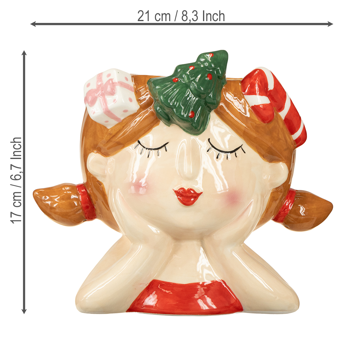 Noël approche à grands pas et vous cherchez un objet pour une décoration de Noël vraiment unique ? Alors, ce ravissant cache-pot en céramique vous fera sourire ! Avec son design charmant en forme de jeune fille rêveuse avec des décorations de Noël dans les cheveux, ce cache-pot apporte non seulement une ambiance de Noël joyeuse à votre intérieur, mais met aussi magnifiquement en valeur vos plantes et vos décorations de l'Avent. Les détails délicats du buste sont particulièrement remarquables, comme les rubans rouges, son regard rêveur et les petits éléments de Noël comme un mini sapin de Noël et une canne à sucre dans les cheveux. Ce cache-pot est idéal pour tous ceux qui souhaitent ajouter une touche d'humour à leur décoration !