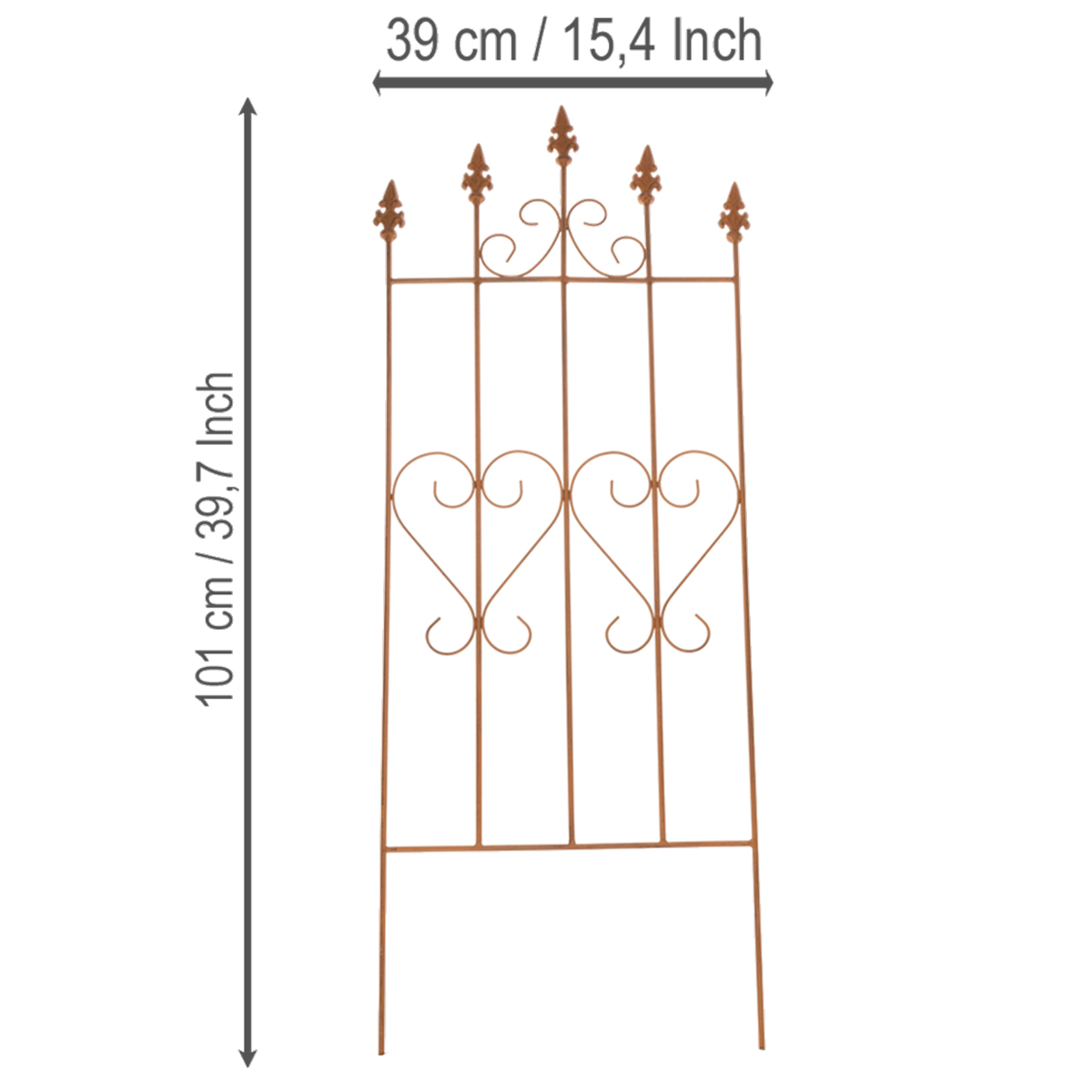 Laissez votre jardin s'épanouir ! Ce treillis, orné d'un motif de cœur empreint de nostalgie, allie romantisme et praticité. Idéal pour les rosiers ou comme bordure décorative charmante, il apporte une touche d'élégance à tout espace extérieur. Mesurant 101 cm de haut, 39 cm de large et 1 cm de profondeur, il est facile à manipuler et peu encombrant. Son aspect acier brun patiné s'harmonise à merveille avec les tons verts naturels et les couleurs éclatantes des fleurs. Sur la terrasse, dans le jardin de devant ou en massif, ce treillis est un accessoire indispensable pour tous les amoureux de la nature.