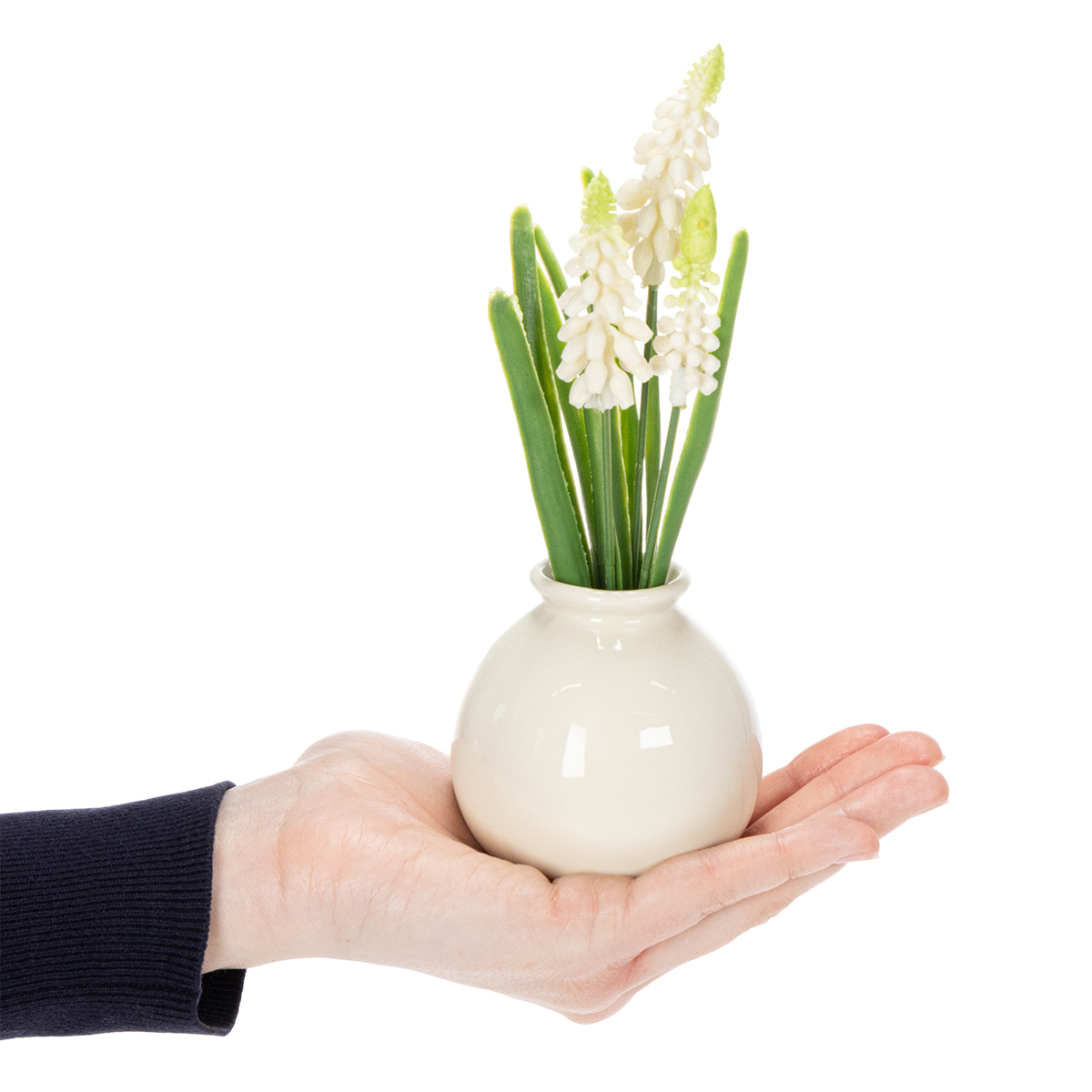 - Couleur : Fleurs blanches délicates, vase blanc crème