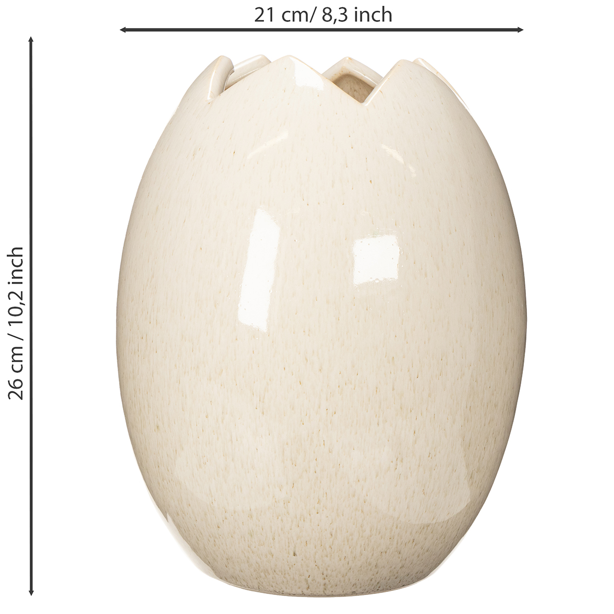 Ce vase décoratif en forme d'œuf allie design moderne et grande fonctionnalité. Avec ses dimensions (26 cm de hauteur, 21 cm de diamètre) et sa céramique de haute qualité, il s'intègre harmonieusement dans tous les intérieurs. Sa finition blanche mouchetée chic dégage une élégance discrète et raffinée. L'effet « coquille d'œuf » craquelé sur le bord supérieur attire tous les regards.