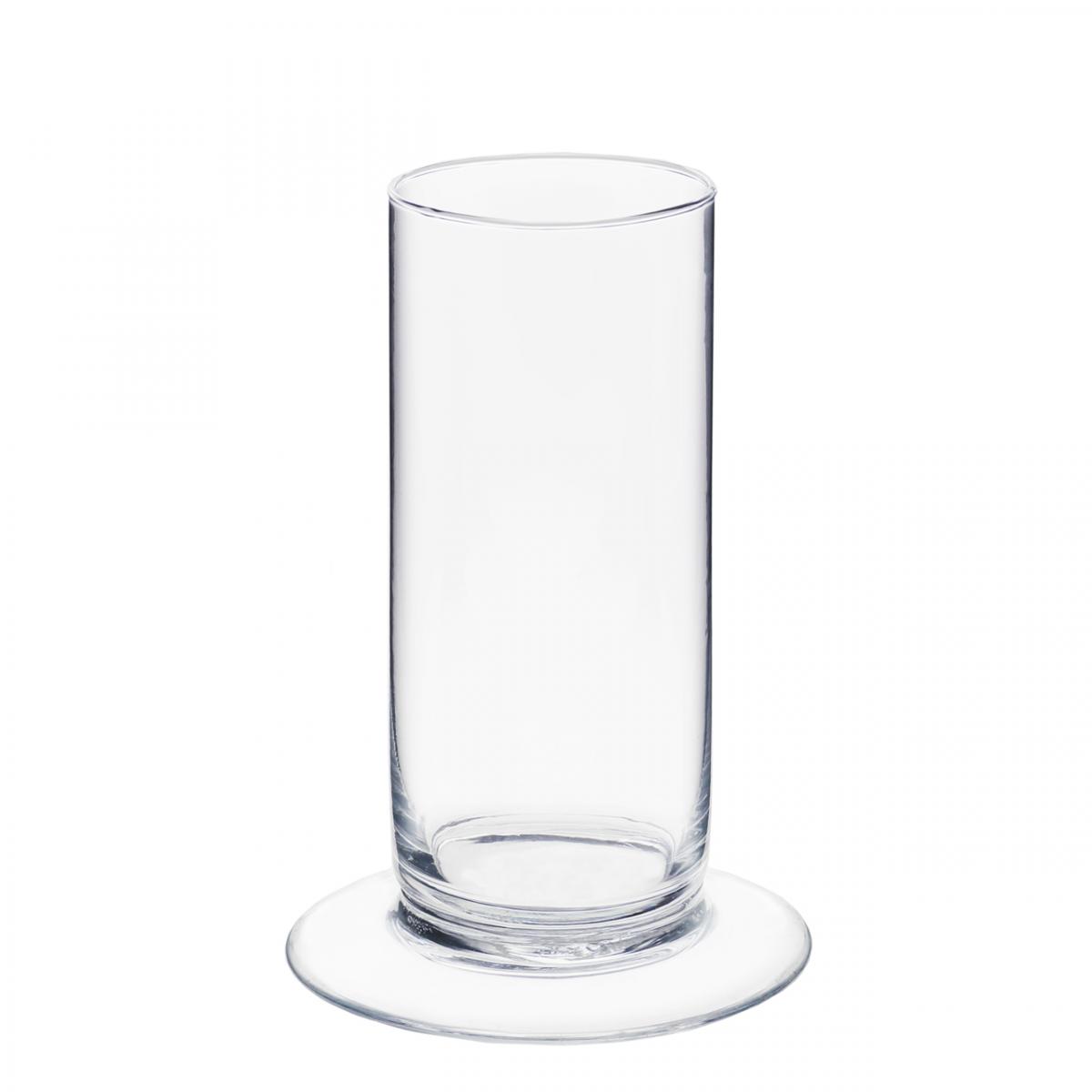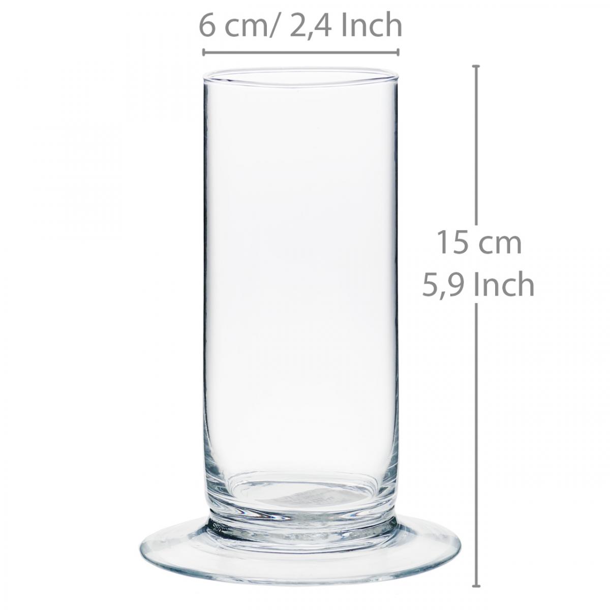 Le cylindre en verre transparent avec base mesure environ 15 centimètres de haut. Le diamètre du vase lui-même est d'environ 6 centimètres.
