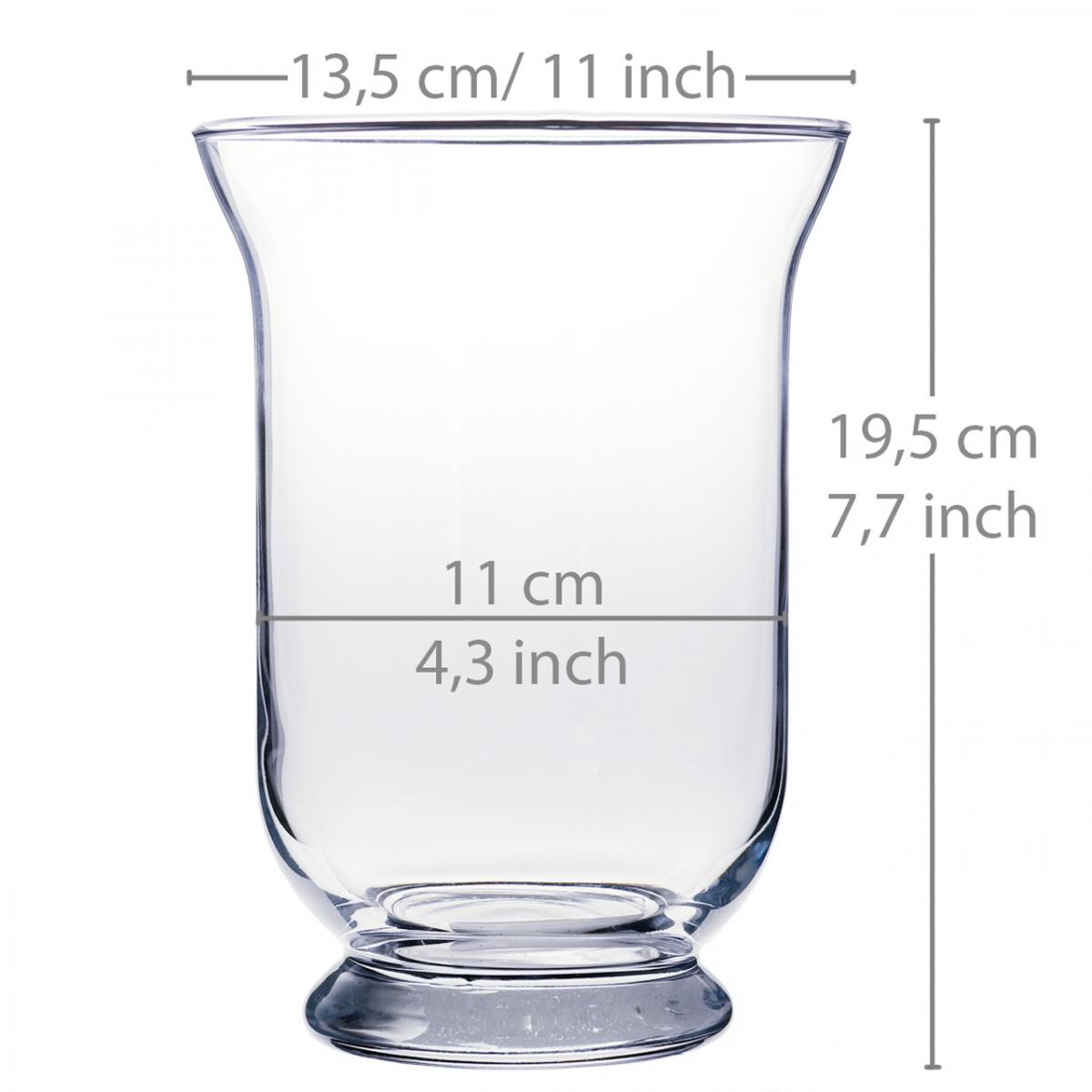 Le vase en verre "Harricon" a une hauteur d'environ 19,5 centimètres et un diamètre total d'environ 13,5 centimètres. Le diamètre d'ouverture est d'environ 11 centimètres, alors que l'empreinte a un diamètre d'environ 9 centimètres.