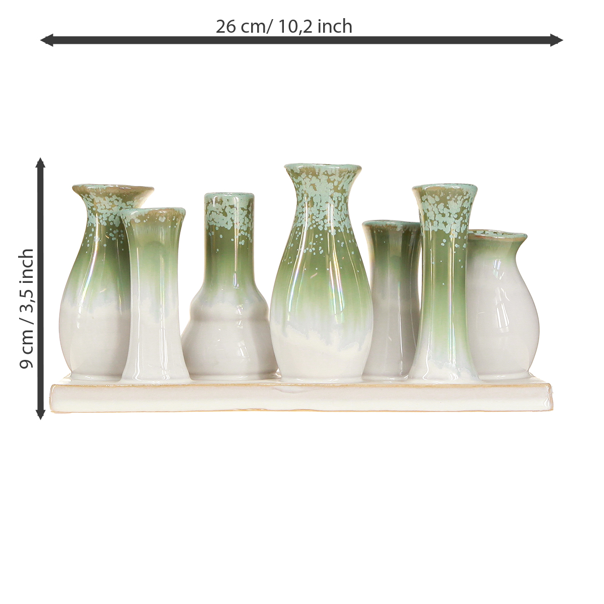 Quand avez-vous embelli votre intérieur pour la dernière fois avec de jolis détails qui lui confèrent une touche spéciale ? Notre ensemble de vases décoratifs en céramique, présenté sur un plateau de qualité, est l'accessoire idéal pour votre maison ! Ces ravissants mini-vases aux douces nuances de vert et de blanc allient élégance et simplicité intemporelle, pour une décoration harmonieuse. Mesurant 26 cm de long et arborant un style rustique, ces vases s'intègrent parfaitement dans toutes les pièces, que ce soit sur la table à manger, le rebord de la fenêtre ou dans l'entrée.
